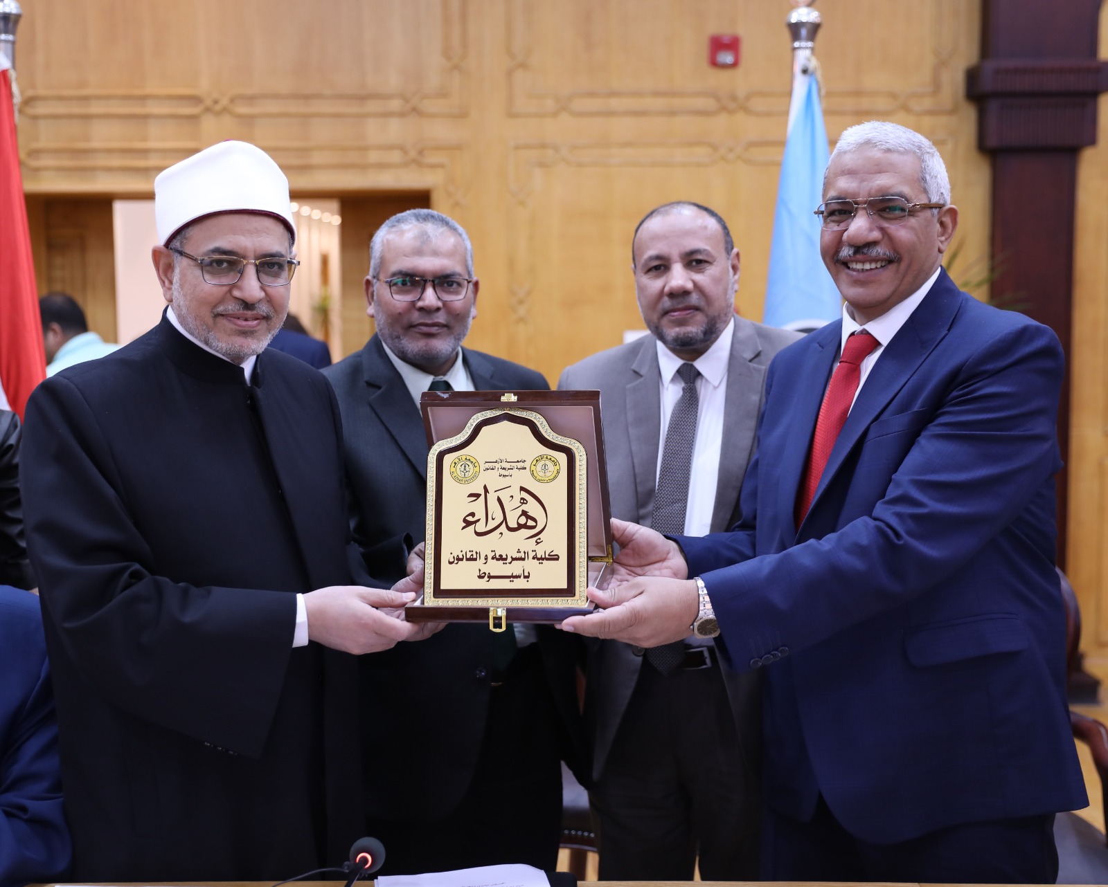 وفي ذات السياق قام الدكتور عبدالفتاح العواري، عميد كلية الشريعة والقانون بأسيوط، بتقديم درع الكلية لفضيلة رئيس الجامعة؛ بمناسبة اليوبيل الذهبي للكلية.