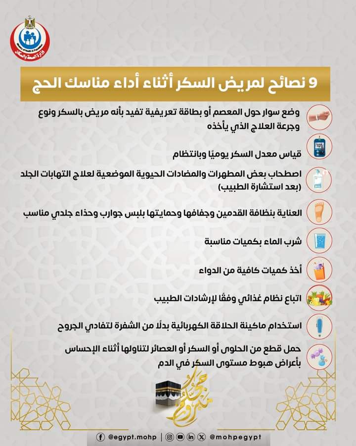 ووجهت وزارة الصحة نصائح يجب أن يتبعها مريض السكر أثناء أداء مناسك الحج حفاظا على صحته منها: