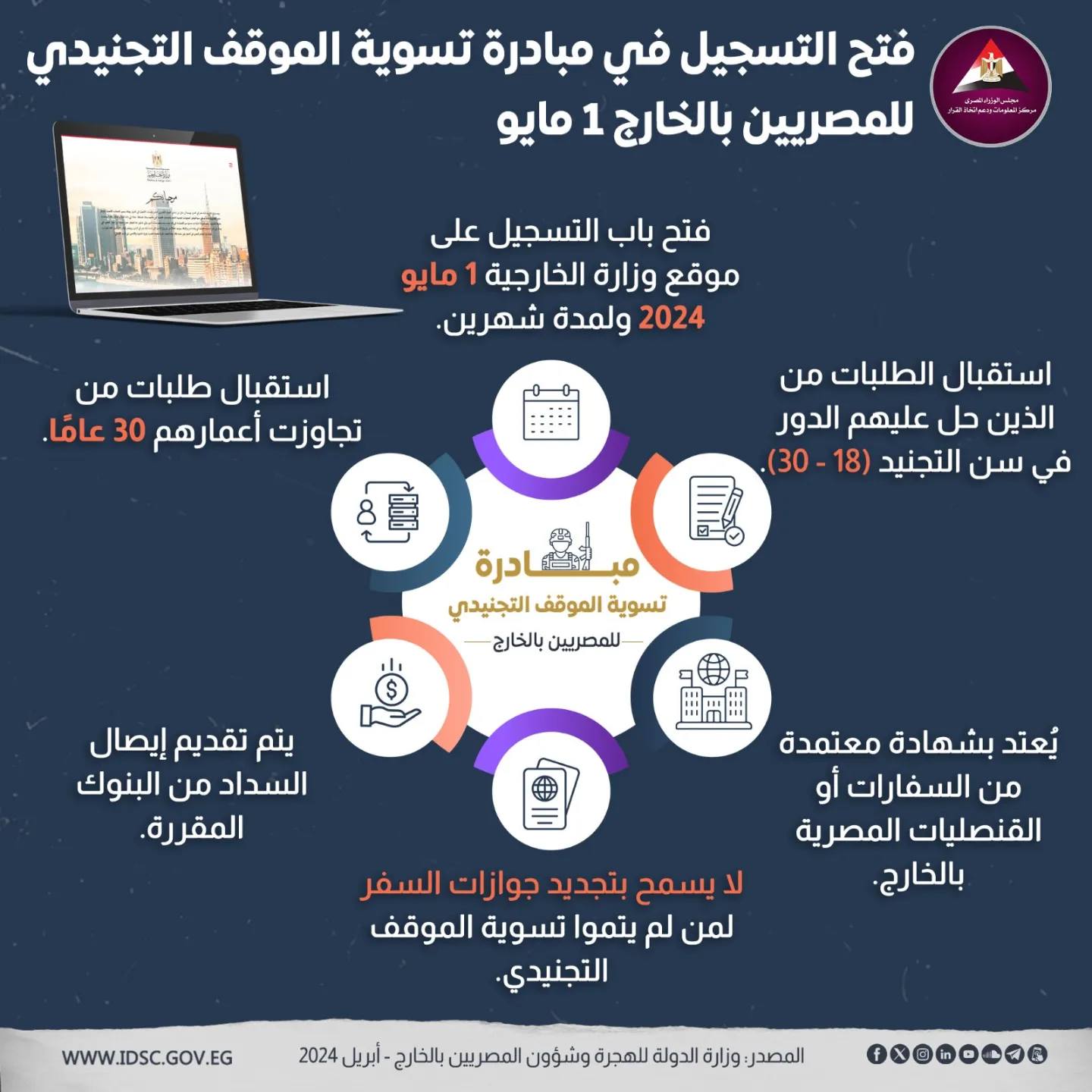 ٤- لا يُسمح بتجديد جوازات السفر للمصريين بالخارج الذين لم يتم تسوية موقفهم التجنيدي.