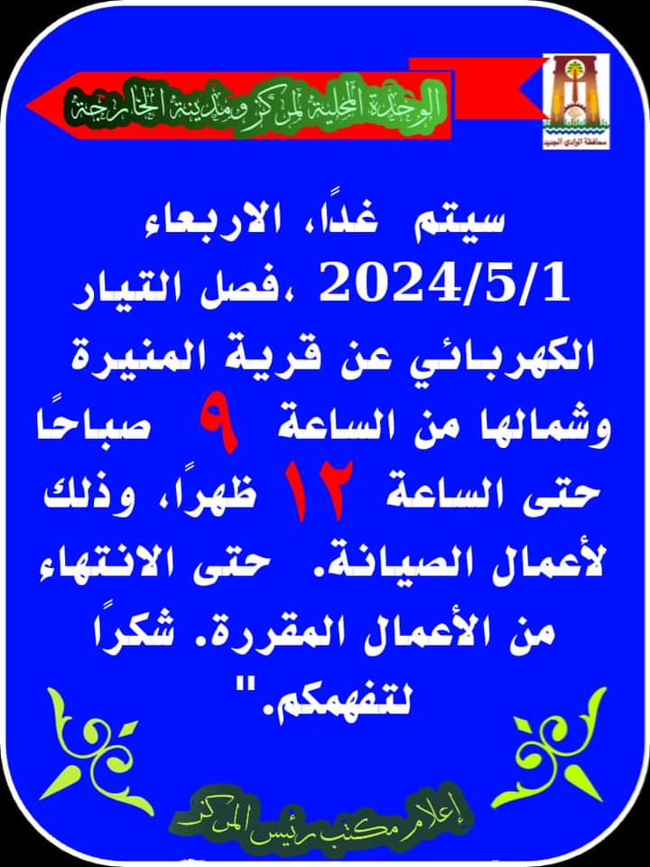 غدًا، فصل التيار الكهربائي عن قرى المنيرة بواحة الخارجة لتنفيذ أعمال الصيانة