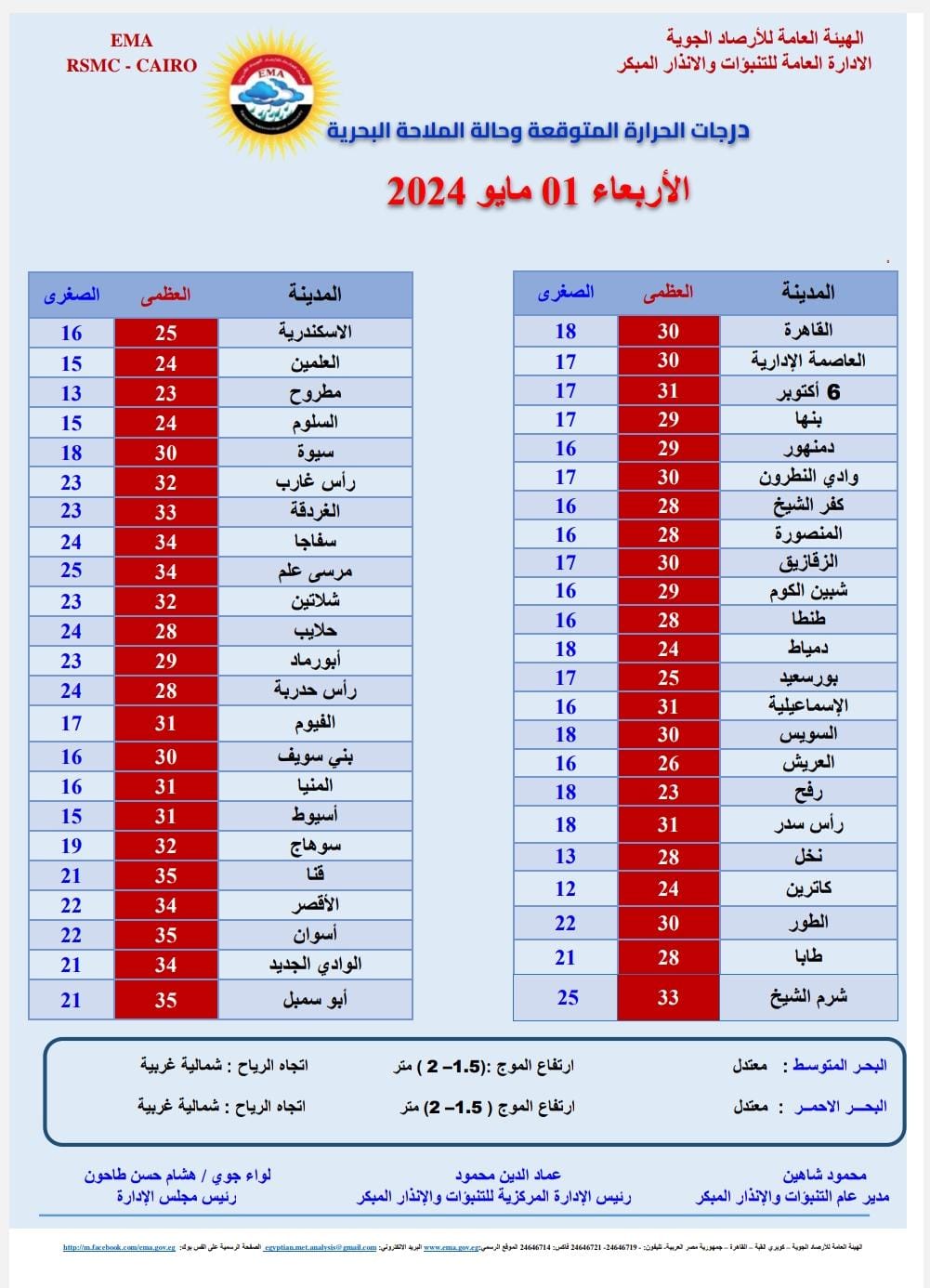 ونشرت هيئة الأرصاد بيانا بدرجات الحرارة المتوقعة اليوم على مدن ومحافظات مصر، والتي جاءت كالتالي: