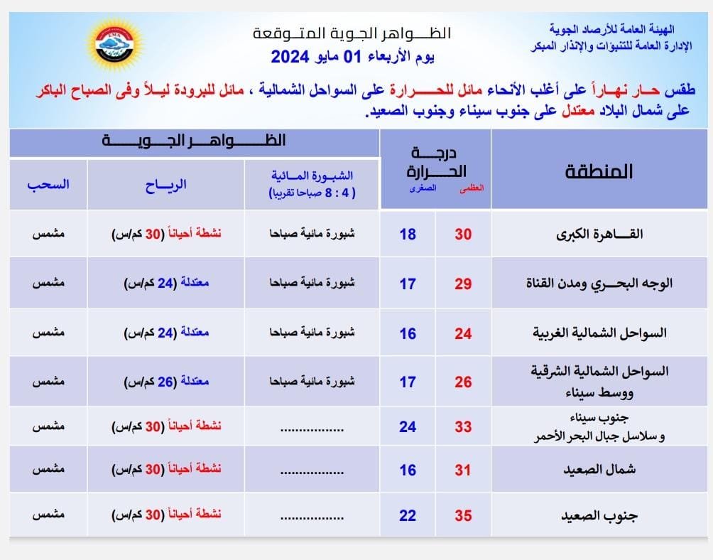 حذرت هيئة الأرصاد الجوية، من حالة الطقس اليوم 1 مايو 2024، مؤكدا أن اليوم يشهد ظاهرتين مؤثرتين رغم استقرار الحالة الجوية.