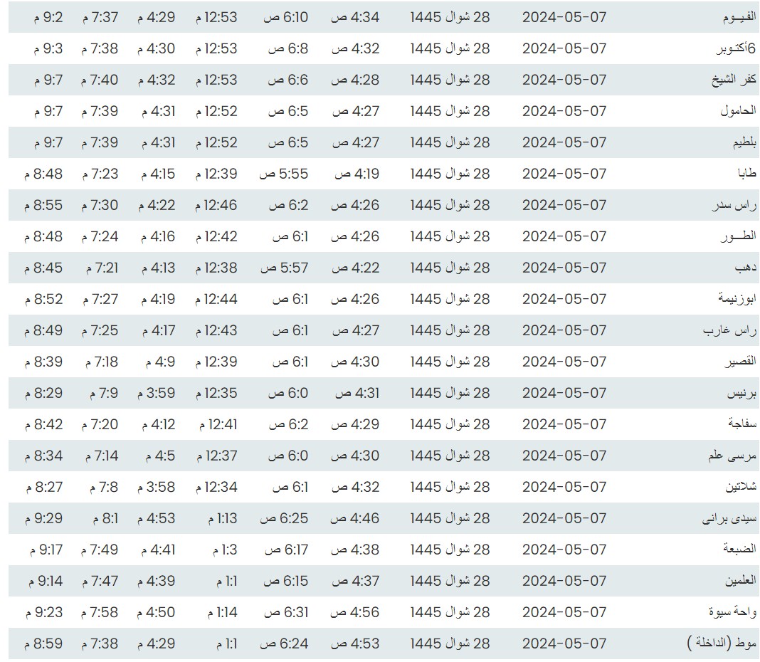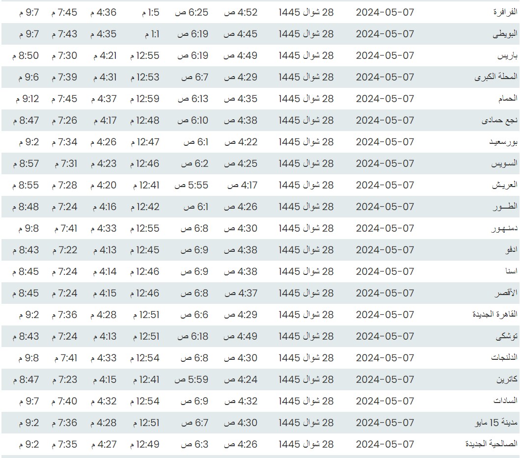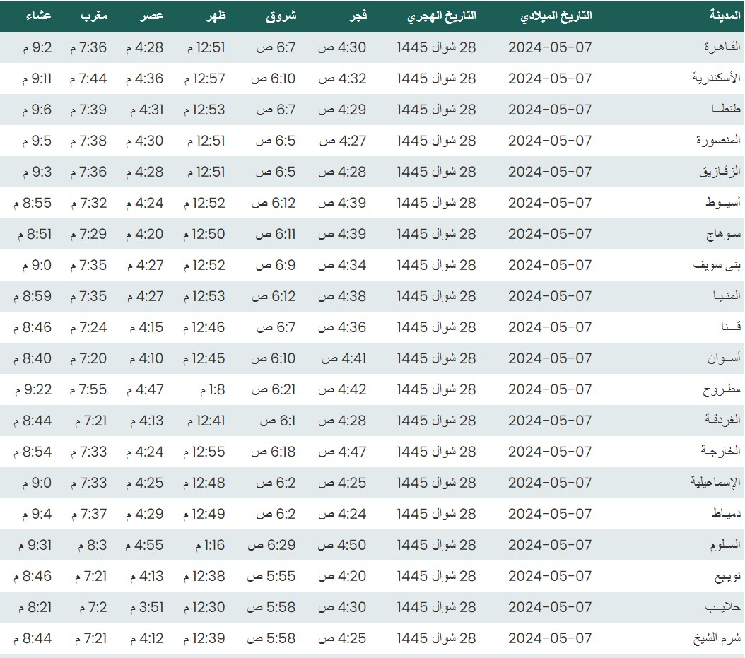 وفيما يلي مواقيت الصلاة، لعدد من مدن ومحافظات الجمهورية من واقع بيانات الهيئة العامة للمساحة