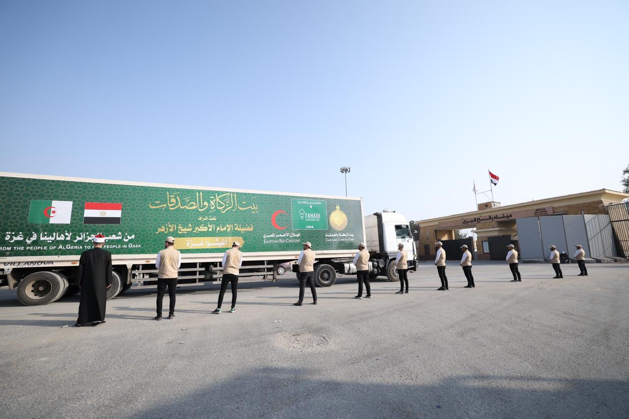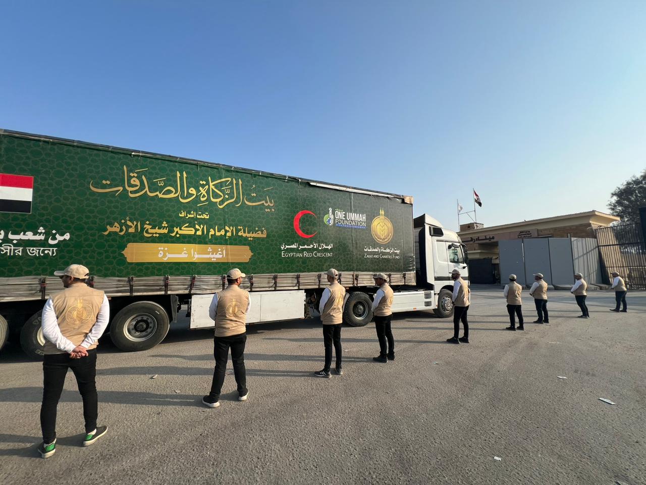 وبلغ إجمالي المساعدات التي قدمها بيت الزكاة والصدقات لإغاثة أهلنا في غزة منذ بدء العدوان الصهيوني حتى الآن (٤٤٠) شاحنة كبرى، محملة بـ (٨٠٠٠) طن من الأدوية والمواد الغذائية والإغاثية ومستلزمات الإيواء والمعيشة، وخصوصًا احتياجات الأطفال والنساء وكبار السِّن، في إطار الدور المعهود الذي يُقدِّمه الأزهر الشريف دائمًا في دعم القضية الفلسطينيَّة؛ حيث عبرت القافلة الأولى ميناء رفح في الأول من نوفمبر ٢٠٢٣م، والثانية في ٢١ نوفمبر، والثالثة صباح يوم الثلاثاء ٢٨ نوفمبر٢٠٢٣، ثم القافلة الرابعة في ٢ يناير ٢٠٢٣م، والخامسة في ١٣ مارس ٢٠٢٤، والسادسة في ٣ أبريل ٢٠٢٤م.