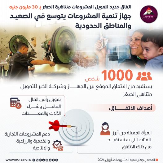 كشف مركز المعلومات ودعم اتخاذ القرار بمجلس الوزراء عن اتفاق جديد لتمويل المشروعات متناهية الصغر بقيمة 30 مليون جنيه من خلال جهاز تنمية المشروعات لتتوسع في مشروعات الصعيد والمناطق الحدودية.
