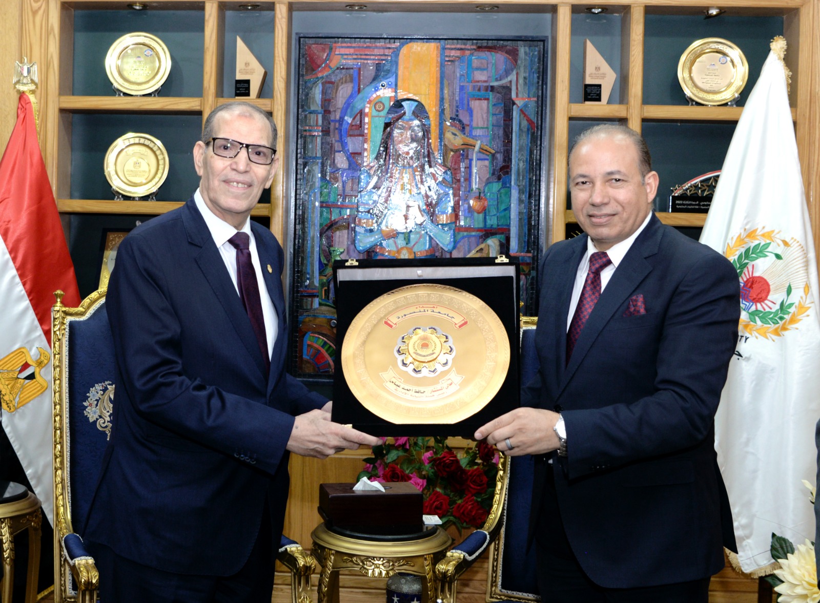 وفي ختام اللقاء، قام كل من الأستاذ الدكتور شريف يوسف خاطر والمستشار حافظ عباس، رئيس هيئة النيابة الإدارية بتبادل الدروع التذكارية.