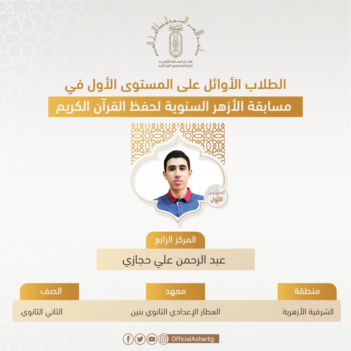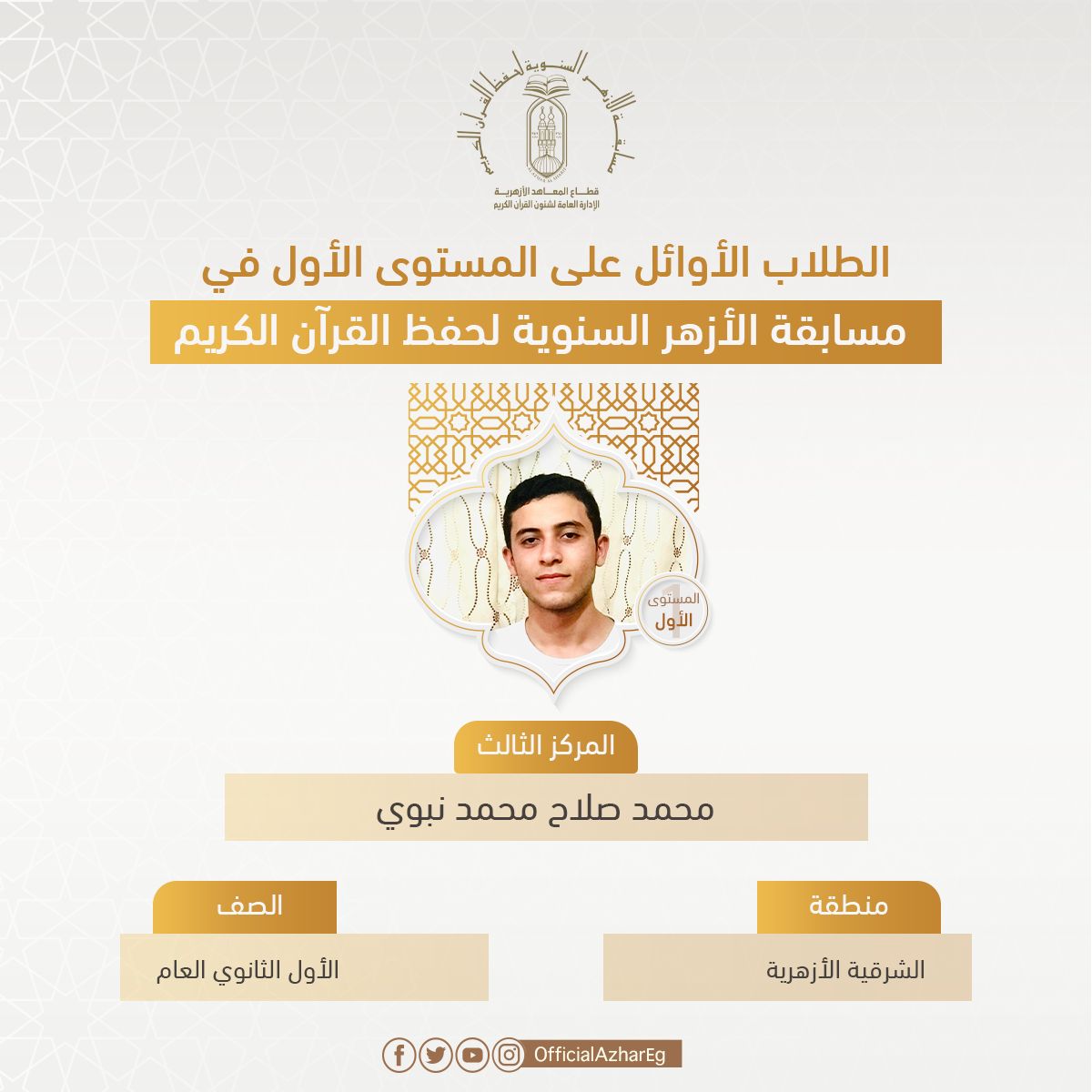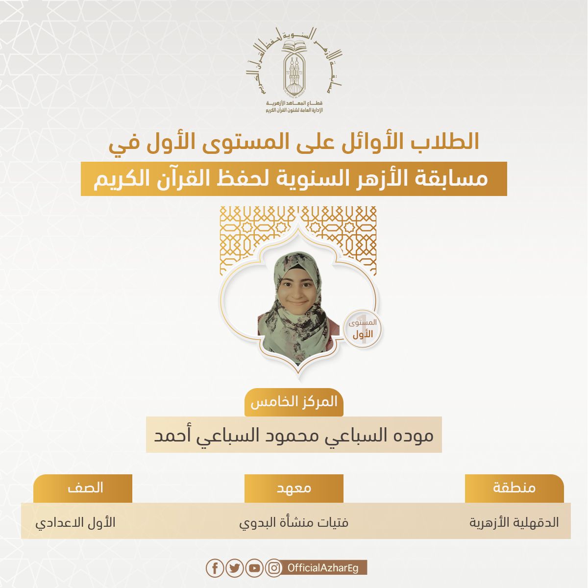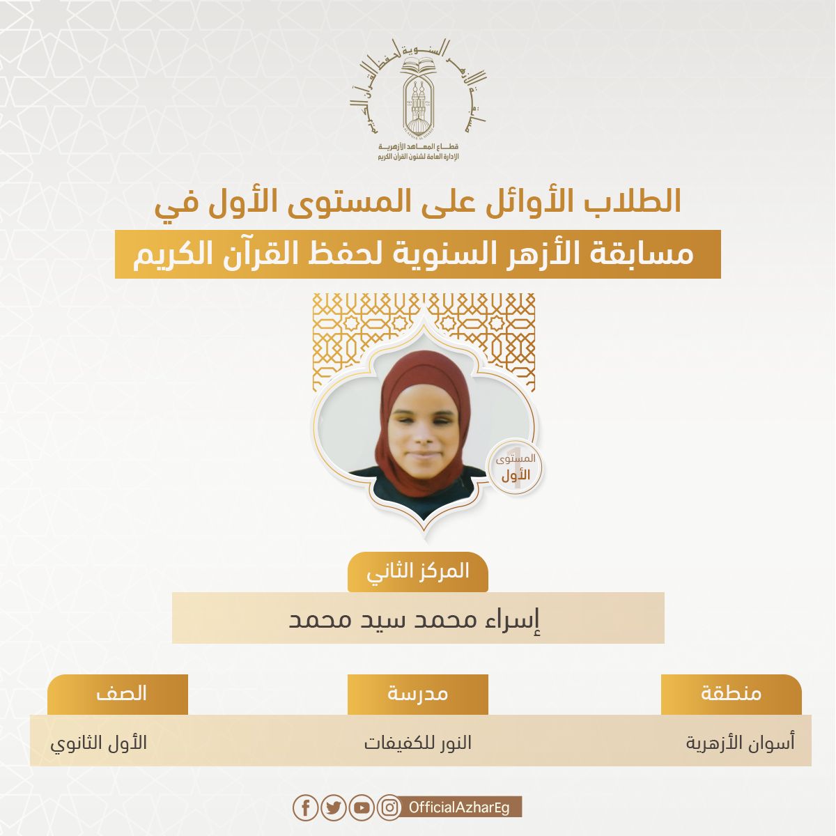 وفي المستوى الأولى، حصلت الطالبة هبة عبد الجليل الجيوشي برهام متولي عمر، الطالبة بالصف الأول الثانوي بمعهد الإمام محمد متولي الشعراوي بمنطقة البحيرة الأزهرية، على المركز الأول، وحصل على المركز الثاني الطالبة إسراء محمد سيد محمد، الطالبة بمدرسة النور للكفيفات بمنطقة أسوان الأزهرية، والمركز الثالث الطالب محمد صلاح محمد نبوي، الطالب بالصف الأول الثانوي بمنطقة الشرقية الأزهرية، والمركز الرابع الطالب عبد الرحمن علي حجازي، الطالب بالصف الثاني الثانوي بمعهد العطار ع.ث بنين بمنطقة الشرقية الأزهرية، والمركز الخامس الطالبة مودة السباعي محمود السباعي، الطالبة بالصف الأول الإعدادي بمعهد فتيات منشأة البدوي بمنطقة الدقهلية الأزهرية.