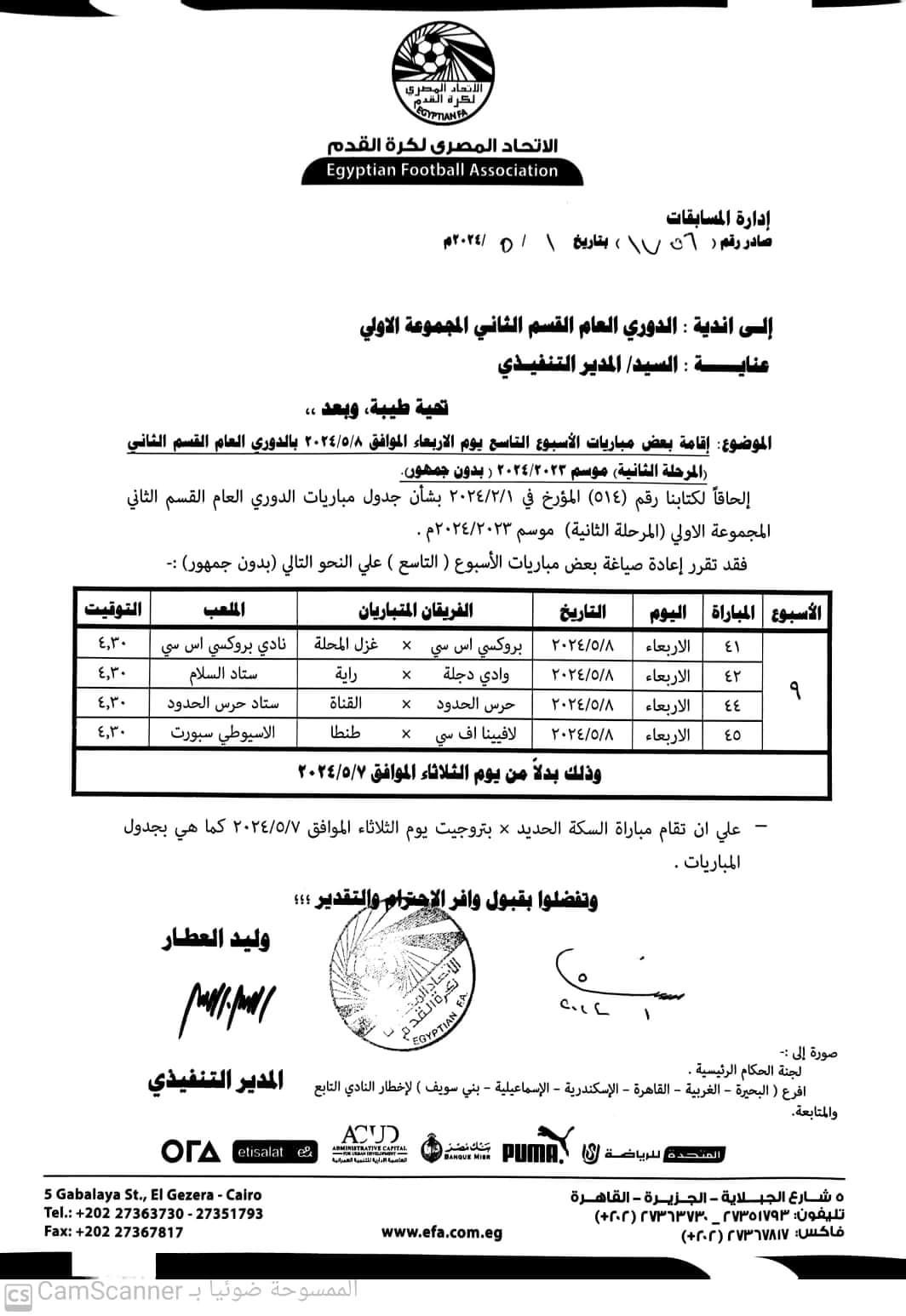 دوري المحترفين، أخطرت لجنة المسابقات بالاتحاد المصري لكرة القدم تعديل موعد مباريات الجولة التاسعة والأخيرة من مباريات دوري القسم الثاني أ “ دوري المحترفين ” لتقام يوم الأربعاء المقبل بدلًا من إقامتها يوم الثلاثاء.