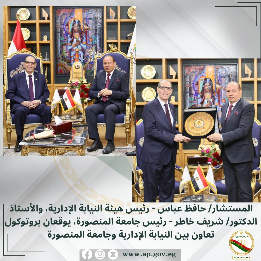 وقام المستشار حافظ عباس، والوفد المرافق له، بزيارة جامعة المنصورة، حيث التقي الأستاذ الدكتور شريف يوسف خاط رئيس جامعة المنصورة ؛ وذلك لتوقيع بروتوكول تعاون بين جامعة المنصورة وهيئة النيابة الإدارية.