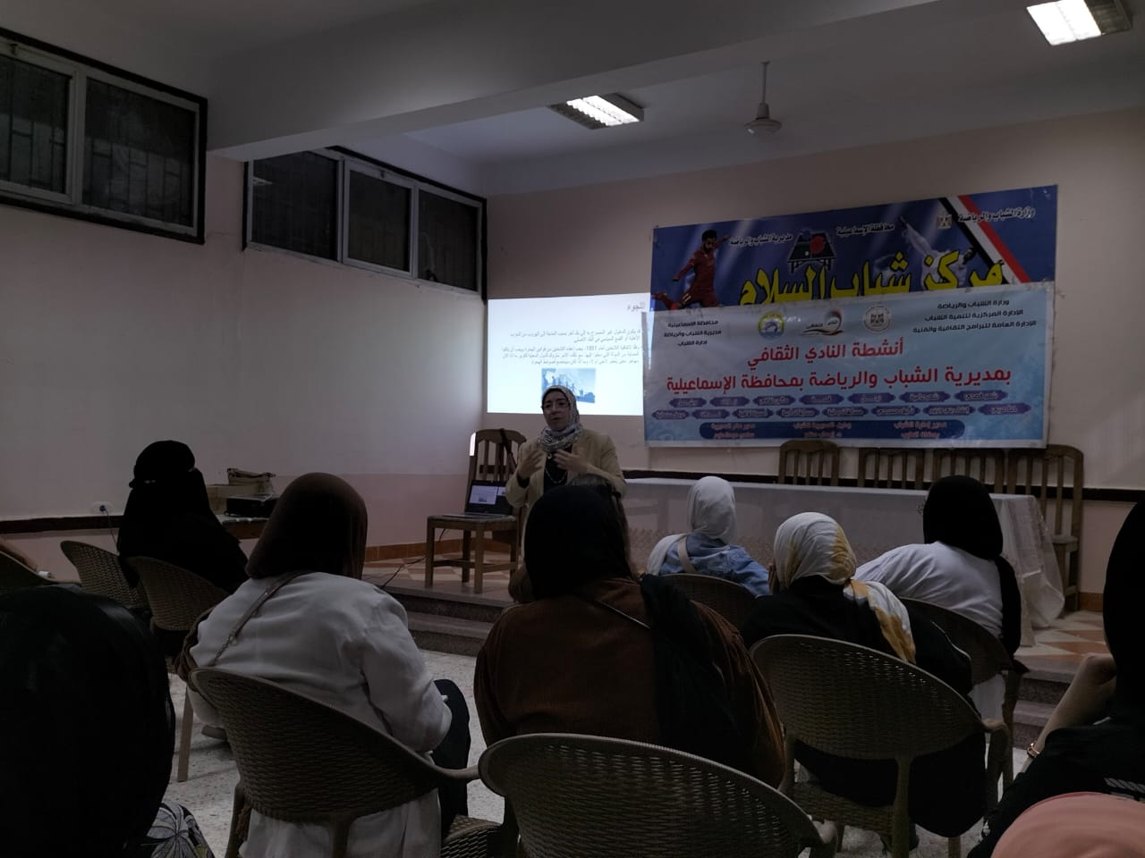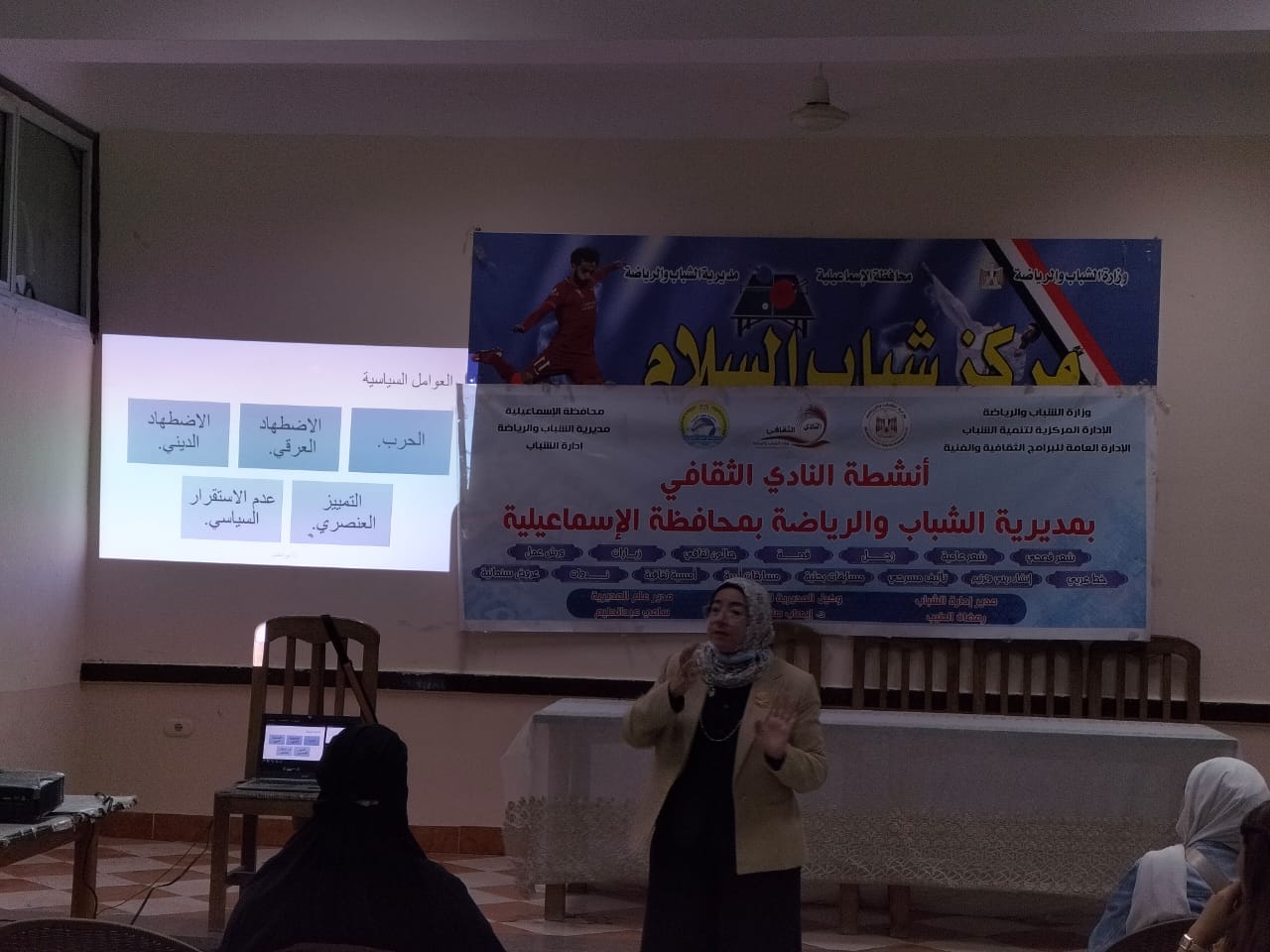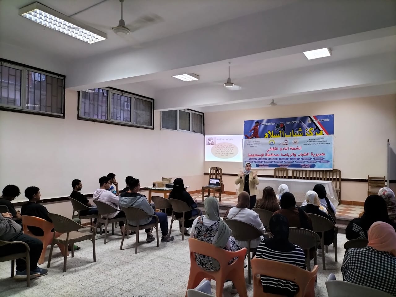 نظم النادى الثقافي بإدارة الشباب بمديرية الشباب والرياضة في محافظة الإسماعيلية، ندوة عن أخطار الهجرة غير الشرعية لأعضاء النادي الثقافي بمركز شباب السلام التابع لفرع حى ثان.