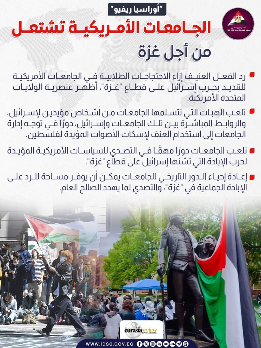 وذلك بعد نشره موقع "أوراسيا ريفيو" مقال عن على موجة الاحتجاجات الطلابية التي تجتاح الجامعات الأمريكية؛ للتنديد بحرب إسرائيل على قطاع "غزة"، والمطالبة بإنهاء الدعم الأمريكي لحرب الإبادة الجماعية التي تشنها إسرائيل على القطاع.