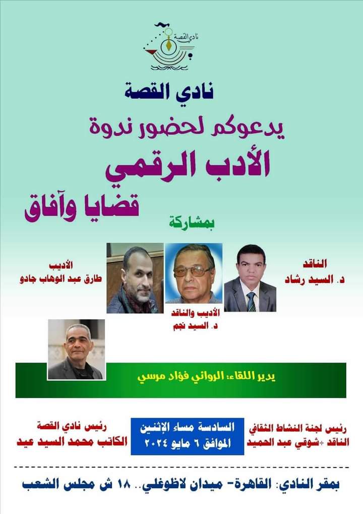 يناقش نادى قصة مصر قضية "الإبداع الرقمى..قضايا وآفاق" فى ندوة الاثنين المقبل الموافق السادس من مايو الجاري.