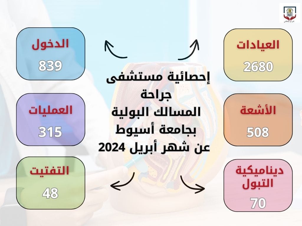 وأشار مدير مستشفى المسالك البولية بجامعة أسيوط أن المستشفى سجل دخول (839) حالة بالأقسام والوحدات المختلفة، وإجراء (315) عملية جراحية، و(508) أشعات تليفزيونية، و(48) حالة تفتييت، و(70) حالة ديناميكية التبول خلال الشهر نفسه.