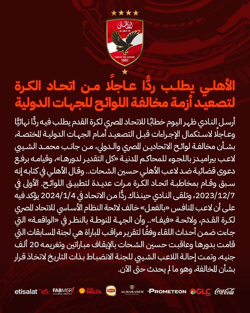 الأهلي يخاطب رسميا اتحاد الكرة بشأن أزمة الشيبي