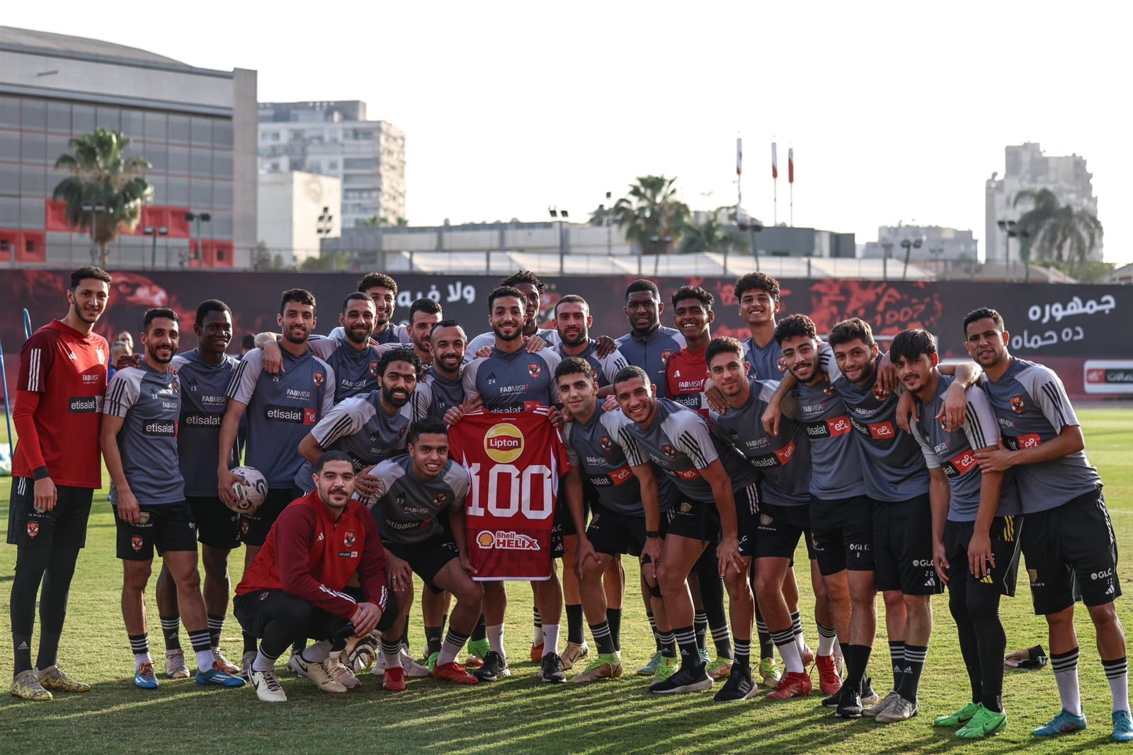 واحتفل محمد عبد المنعم مدافع النادي الأهلي بمباراته رقم 100 مع المارد الأحمر علي هامش تدريبات الفريق التي أقيمت اليوم علي ملعب التتش بمقر النادي الأهلي.