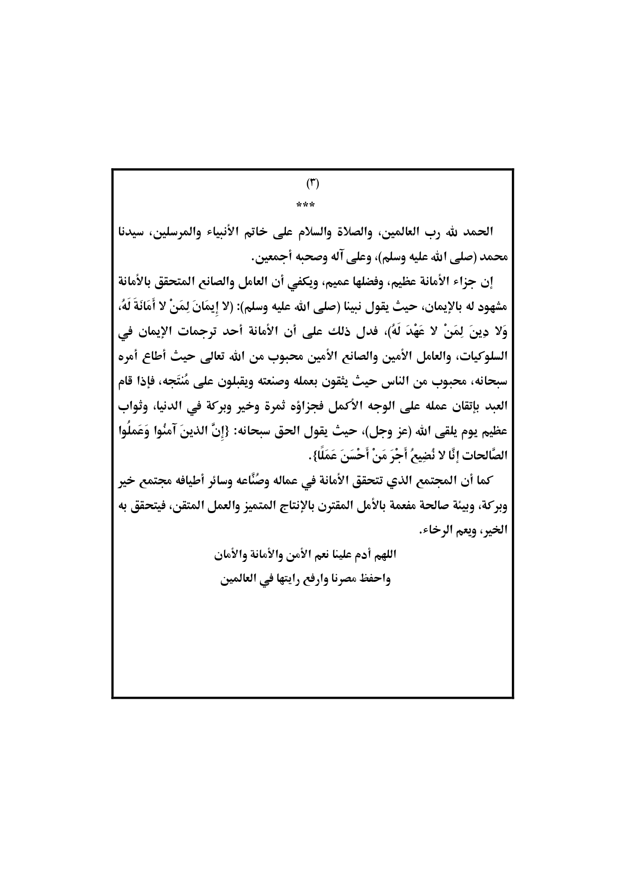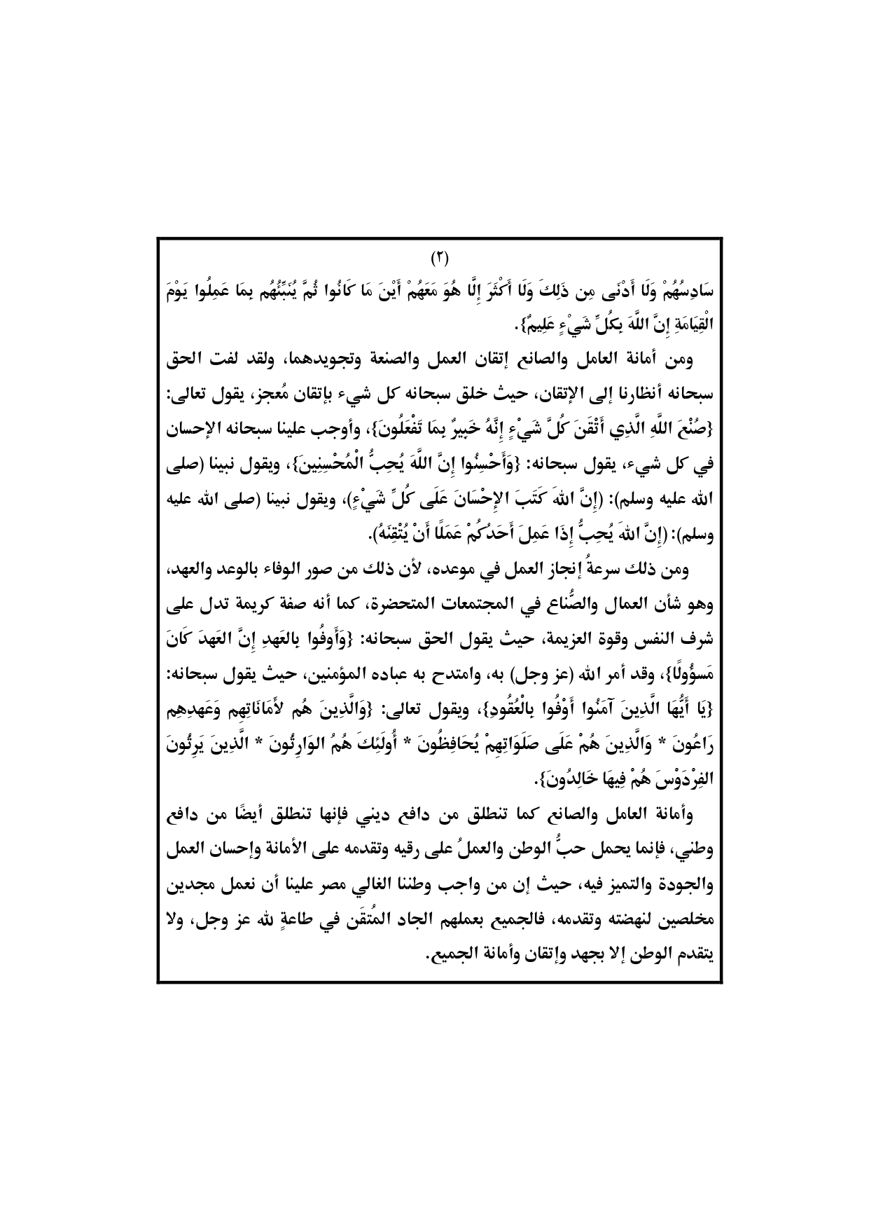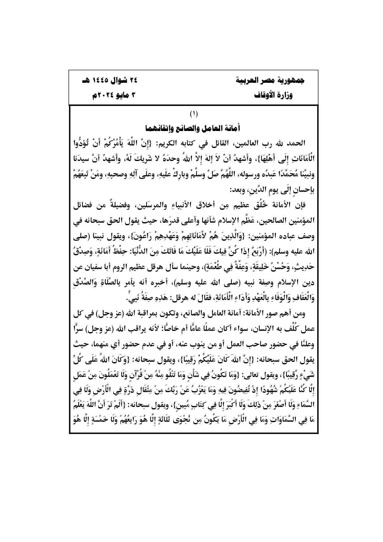 حددت وزارة الأوقاف موضوع خطبة اليوم الجمعة تحت عنوان “أمانة العامل والصانع وإتقانهما”.