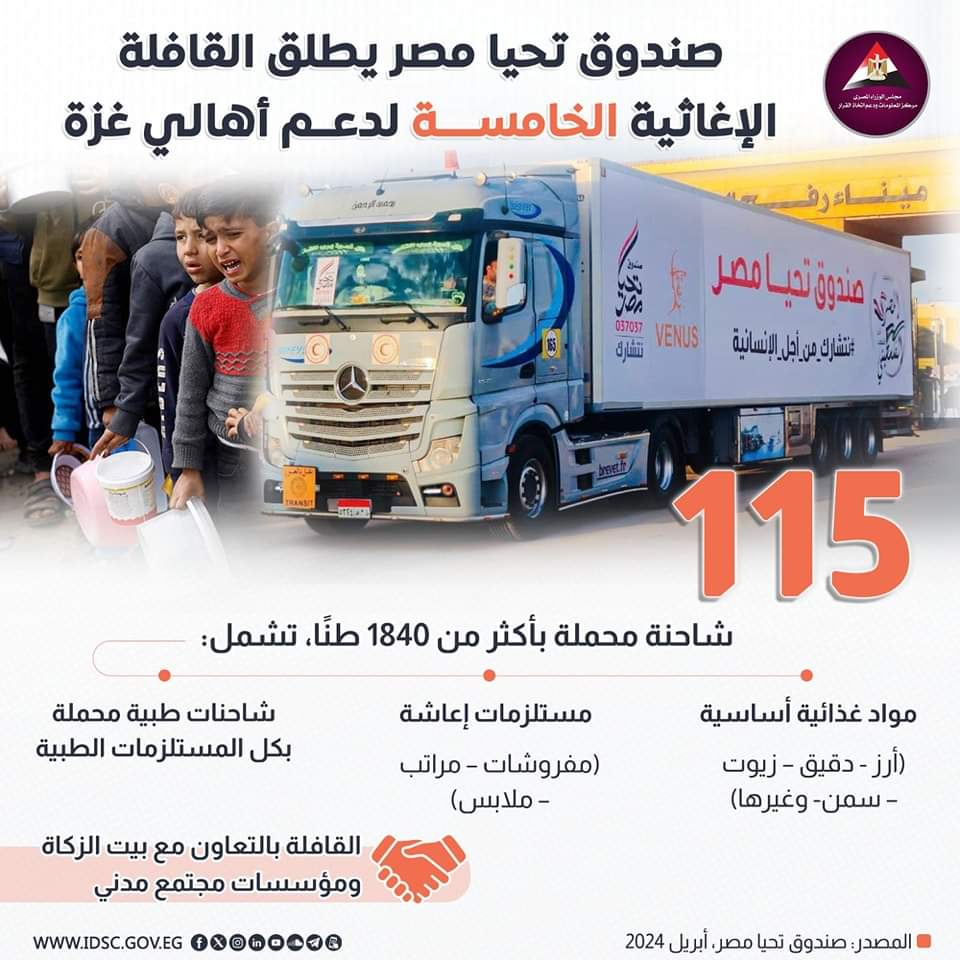 وذلك تنفيذًا لتوجيهات الرئيس عبد الفتاح السيسي بمد يد العون لأهالي قطاع غزة، وفي إطار جهود صندوق تحيا مصر الإنسانية المستمرة لدعم الأشقاء الفلسطينيين، انطلقت القافلة الإغاثية الخامسة، الإثنين 29 أبريل 2024، إلى قطاع غزة، تحت شعار "نتشارك من أجل الإنسانية"، لتعزيز أواصر الترابط الأخوي بين الشعبين المصري والفلسطيني، بالتعاون مع بيت الزكاة والصدقات المصري، وشركة فينوس للكهرباء والإنارة، وعدد من مؤسسات المجتمع المدني.