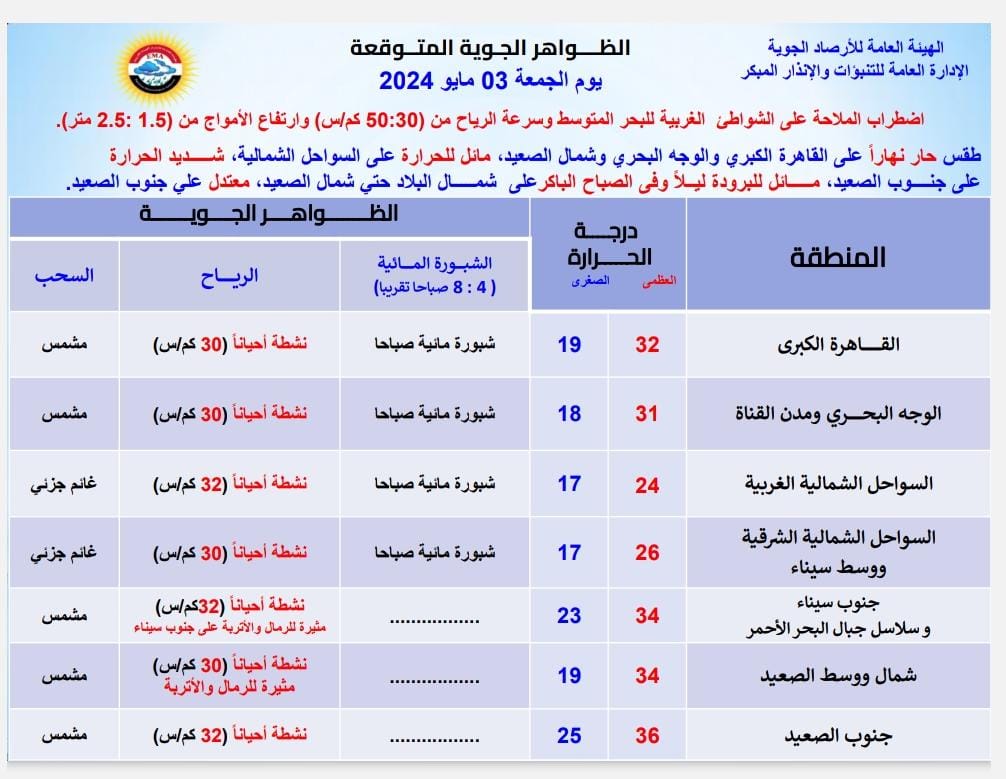 أعلنت هيئة الأرصاد الجوية، تغيرات في حالةَ الطقس اليوم الجمعة 3 مايو 2024، محذرة من 3 ظواهر جوية تشهدها بعض المناطق في مصر.