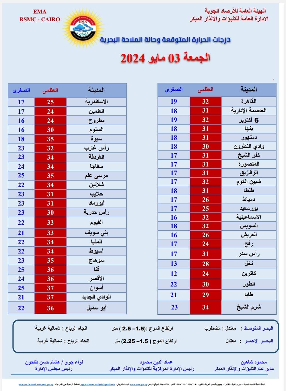 ونشرت هيئة الأرصاد الجوية بيانا بدرجات الحرارة المتوقعة اليوم على مدن ومحافظات مصر، وجاءت كالتالي: