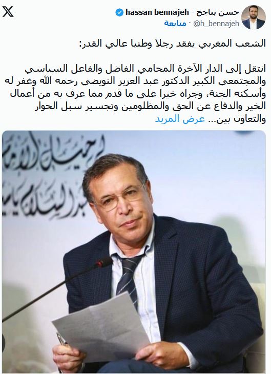 والراحل هو مؤسس ورئيس سابق لجمعية "عدالة" الحقوقية، وعمل خلال مسيرته الحقوقية كاتبًا عامًا للجمعية المغربية لمحاربة الرشوة، وهي منظمة غير حكومية تُعنى بمكافحة الفساد وتعزيز الشفافية.