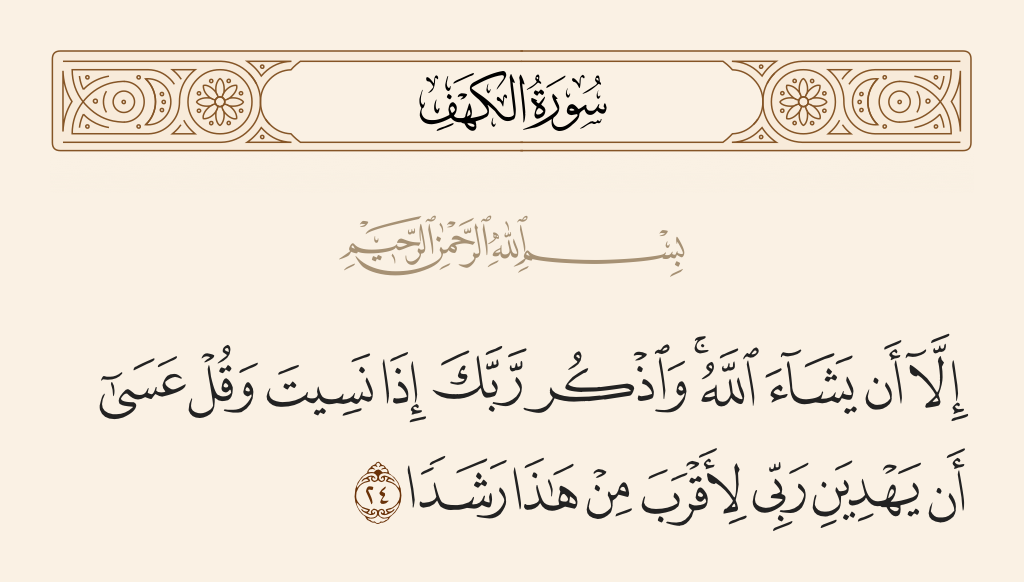 قال تعالى: «وَلَا تَقُولَنَّ لِشَيْءٍ إِنِّي فَاعِلٌ ذَلِكَ غَدًا (23) إِلَّا أَنْ يَشَاءَ اللَّهُ وَاذْكُرْ رَبَّكَ إِذَا نَسِيتَ وَقُلْ عَسَى أَنْ يَهْدِيَنِ رَبِّي لِأَقْرَبَ مِنْ هَذَا رَشَدًا (24)».