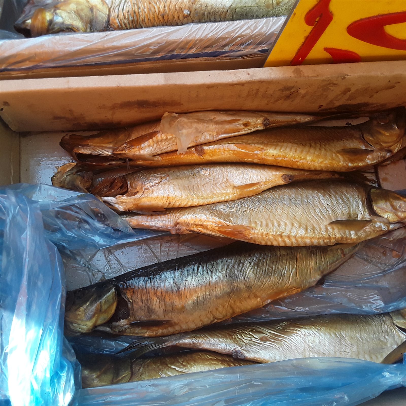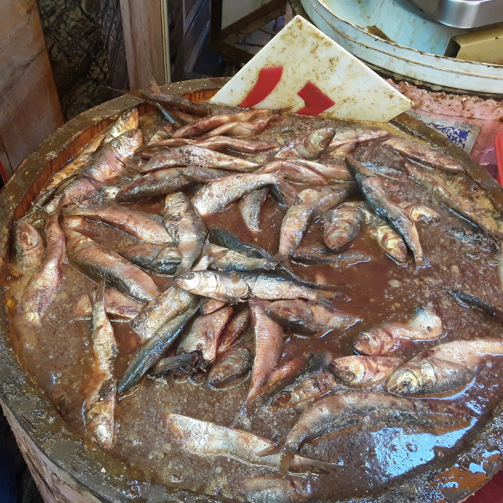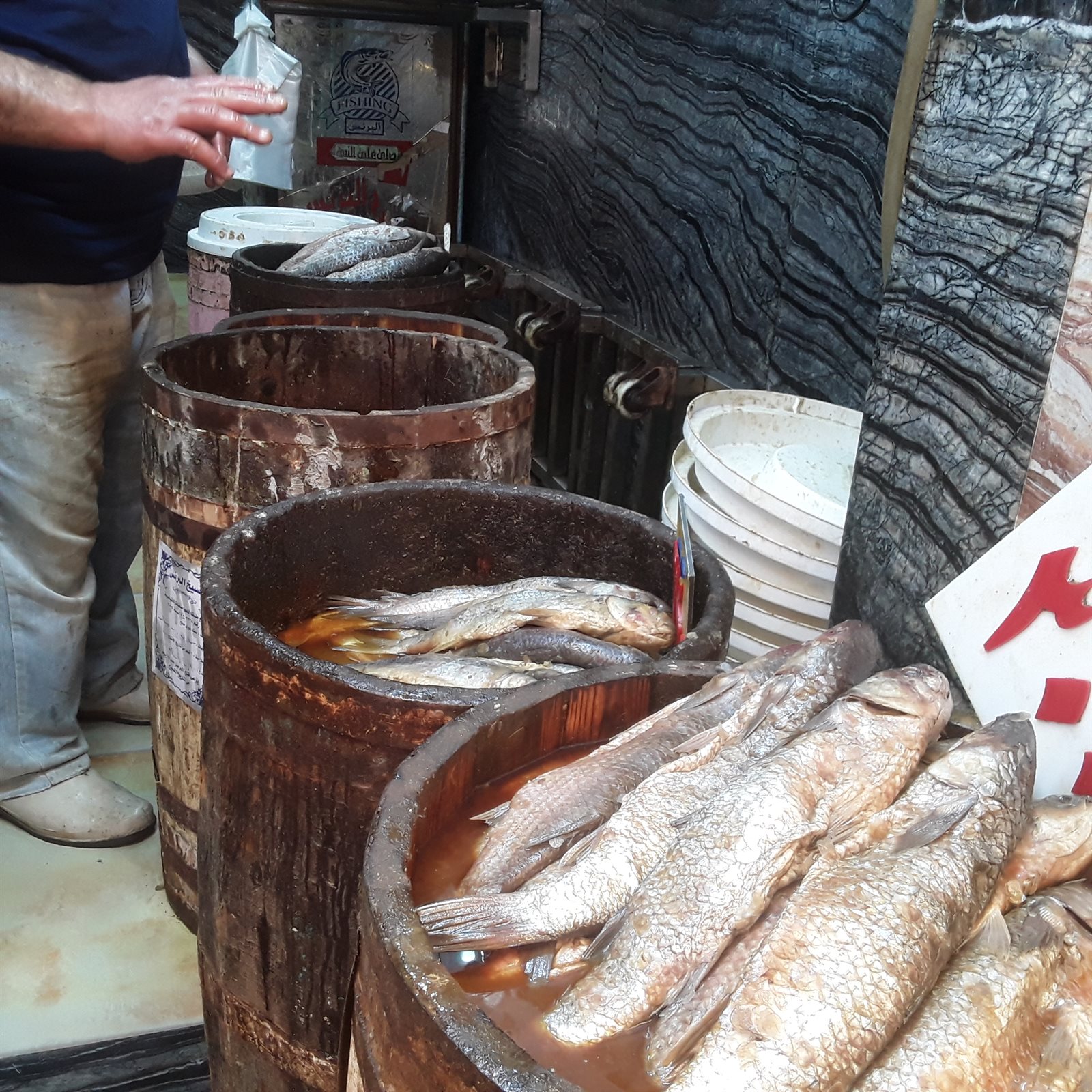 وحرص أصحاب المحلات التجارية على افتراش مختلف أنواع الأسماك المملحة وأحجامها وأشكالها المختلفة والتي منها الرنجة والفسيخ والسردين لجذب الزبائن لشراء كافة المأكولات والأطباق المتنوعة الجاهزة من الأسماك.