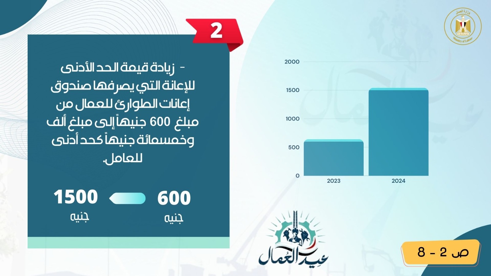 2-زيادة قيمة الحد الأدنى للإعانة التي يصرفها صندوق إعانات الطوارئ للعمال من مبلغ 600 جنيهًا إلى مبلغ ألف وخمسمائة جنيهًا كحد أدنى للعامل.