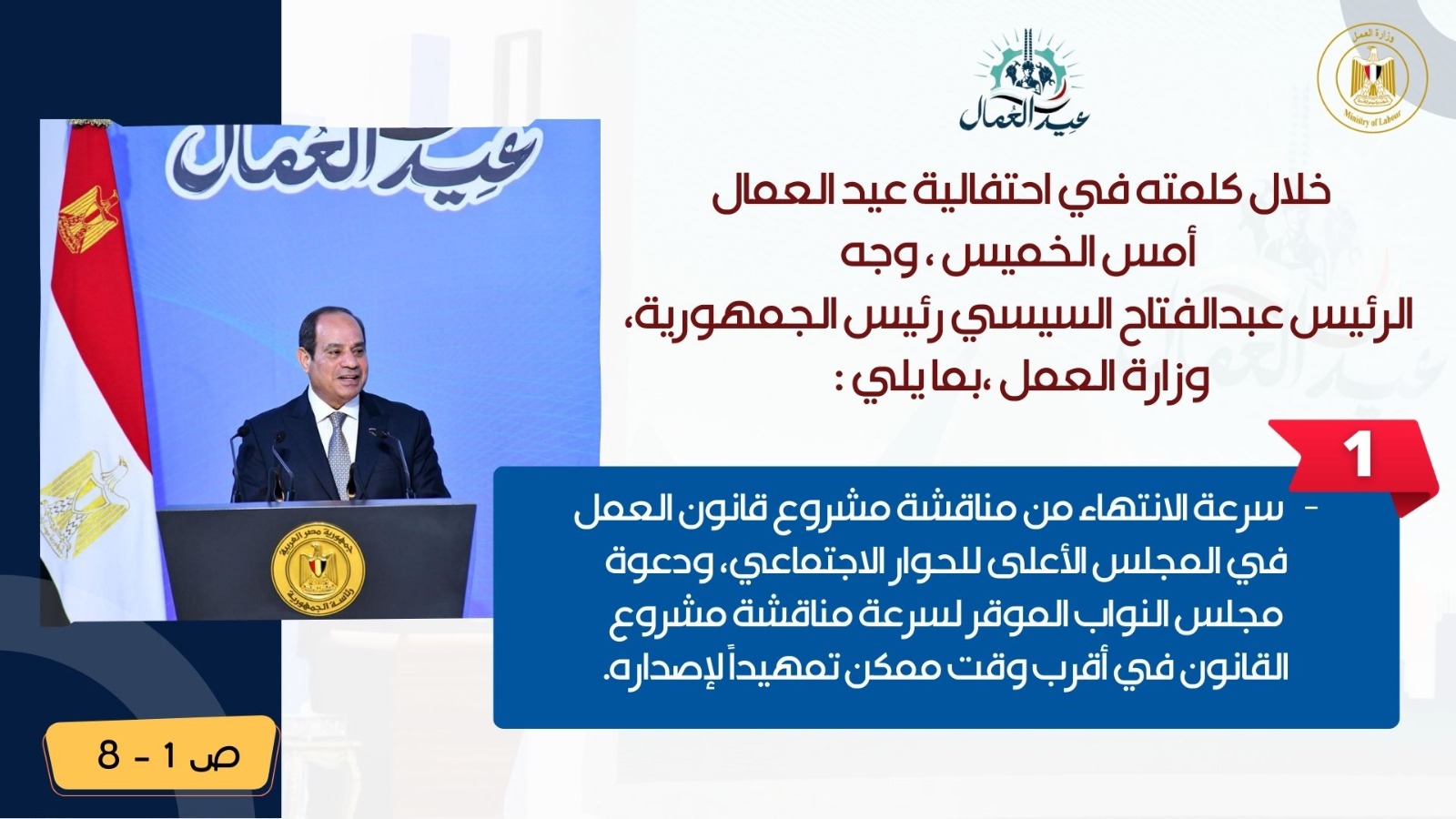 1- سرعة الانتهاء من مناقشة مشروع قانون العمل في المجلس الأعلى للحوار الاجتماعي، ودعوة مجلس النواب الموقر لسرعة مناقشة مشروع القانون في أقرب وقت ممكن تمهيدًا لإصداره.