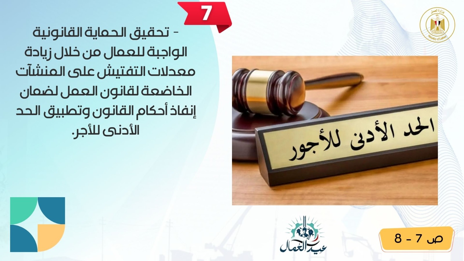 8-تحقيق الحماية القانونية الواجبة للعمال من خلال زيادة معدلات التفتيش على المنشآت الخاضعة لقانون العمل لضمان إنفاذ أحكام القانون وتطبيق الحد الأدنى للأجر.