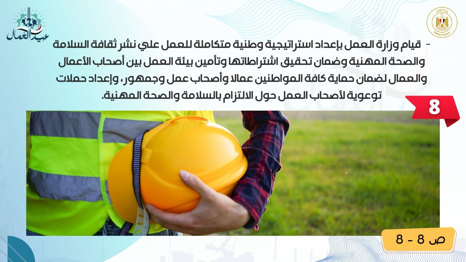 6-قيام وزارة العمل بإعداد استراتيجية وطنية متكاملة للعمل علي نشر ثقافة السلامة والصحة المهنية وضمان تحقيق اشتراطاتها وتأمين بيئة العمل بين أصحاب الأعمال والعمال لضمان حماية كافة المواطنين عمالا وأصحاب عمل وجمهور، وإعداد حملات توعوية لأصحاب العمل حول الالتزام بالسلامة والصحة المهنية.