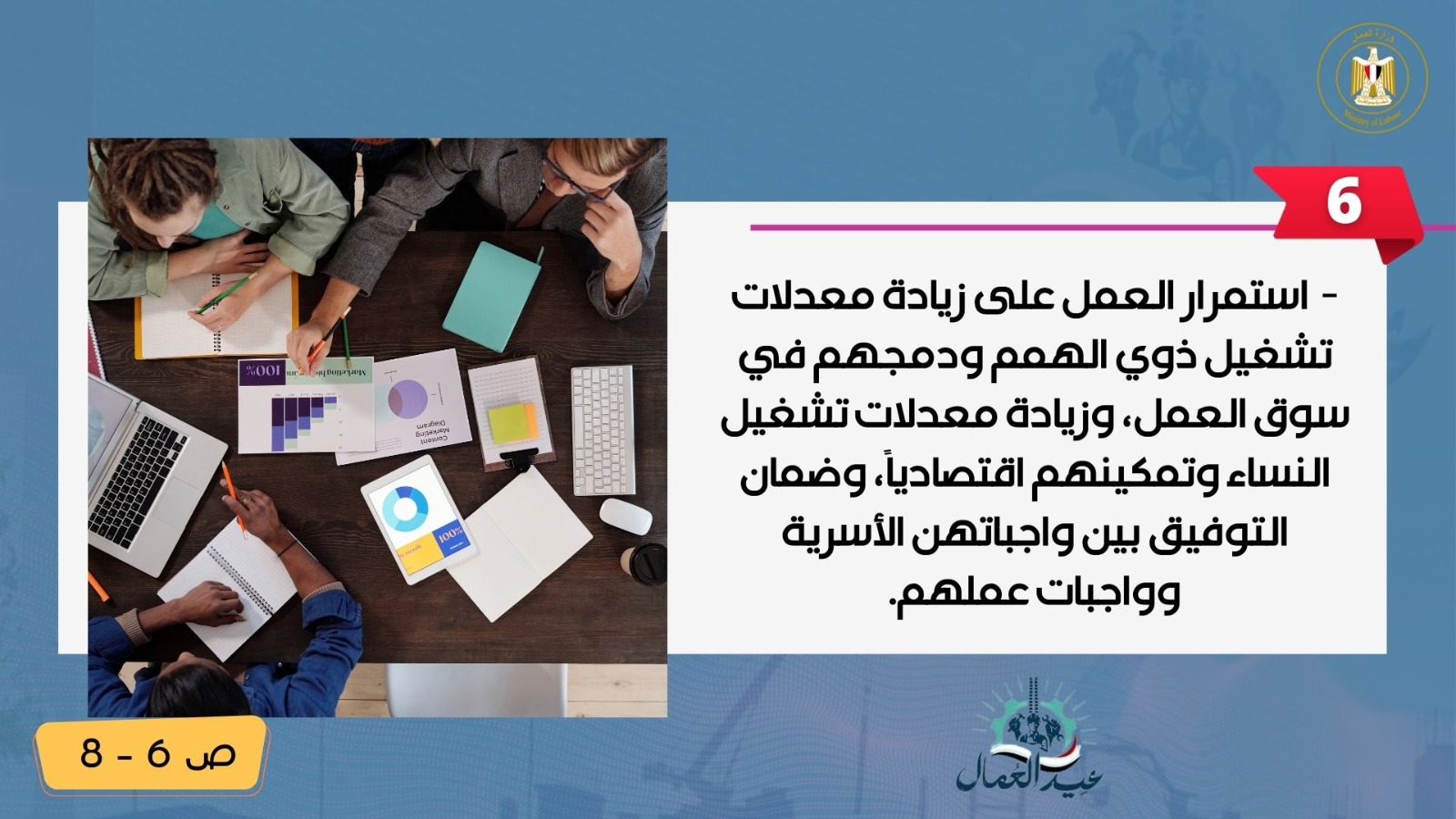 7- استمرار العمل على زيادة معدلات تشغيل ذوي الهمم ودمجهم في سوق العمل، وزيادة معدلات تشغيل النساء وتمكينهم اقتصاديًا، وضمان التوفيق بين واجباتهن الأسرية وواجبات عملهم.
