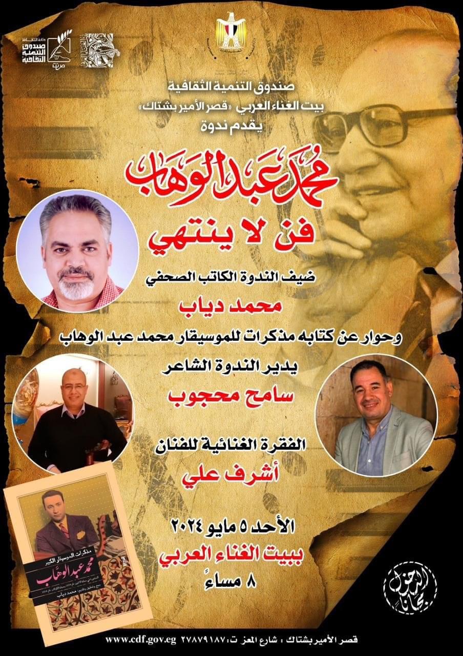 يقدم بيت الغناء العربي بقصر الأمير بشتاك، بشارع المعز بمنطقة الأزهر، والتابع لقطاع صندوق التنمية الثقافية، في تمام الثامنة من مساء الأحد المقبل الموافق 5 مايو الجاري، ندوة فنية غنائية بعنوان "محمد عبد الوهاب.. فن لا ينتهي".