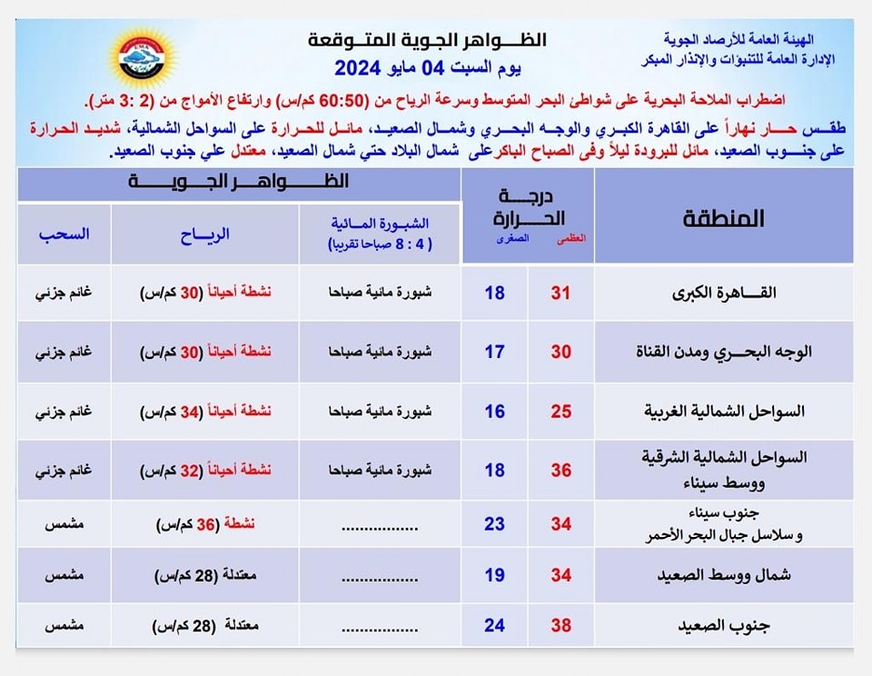 كشفت هيئة الأرصاد الجوية عن حالة الطقس اليوم السبت 4 مايو 2024، محذرة من 3 ظواهر مقلقة تشهدها عدة مناطق من الجمهورية.