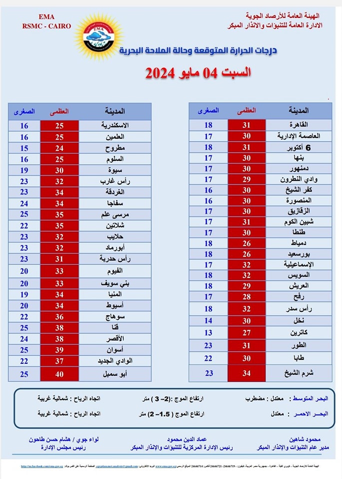 ونشرت هيئة الأرصاد الجوية بيانا بدرجات الحرارة المتوقعة اليوم السبت على مدن ومحافظات مصر، وجاءت كالتالي: