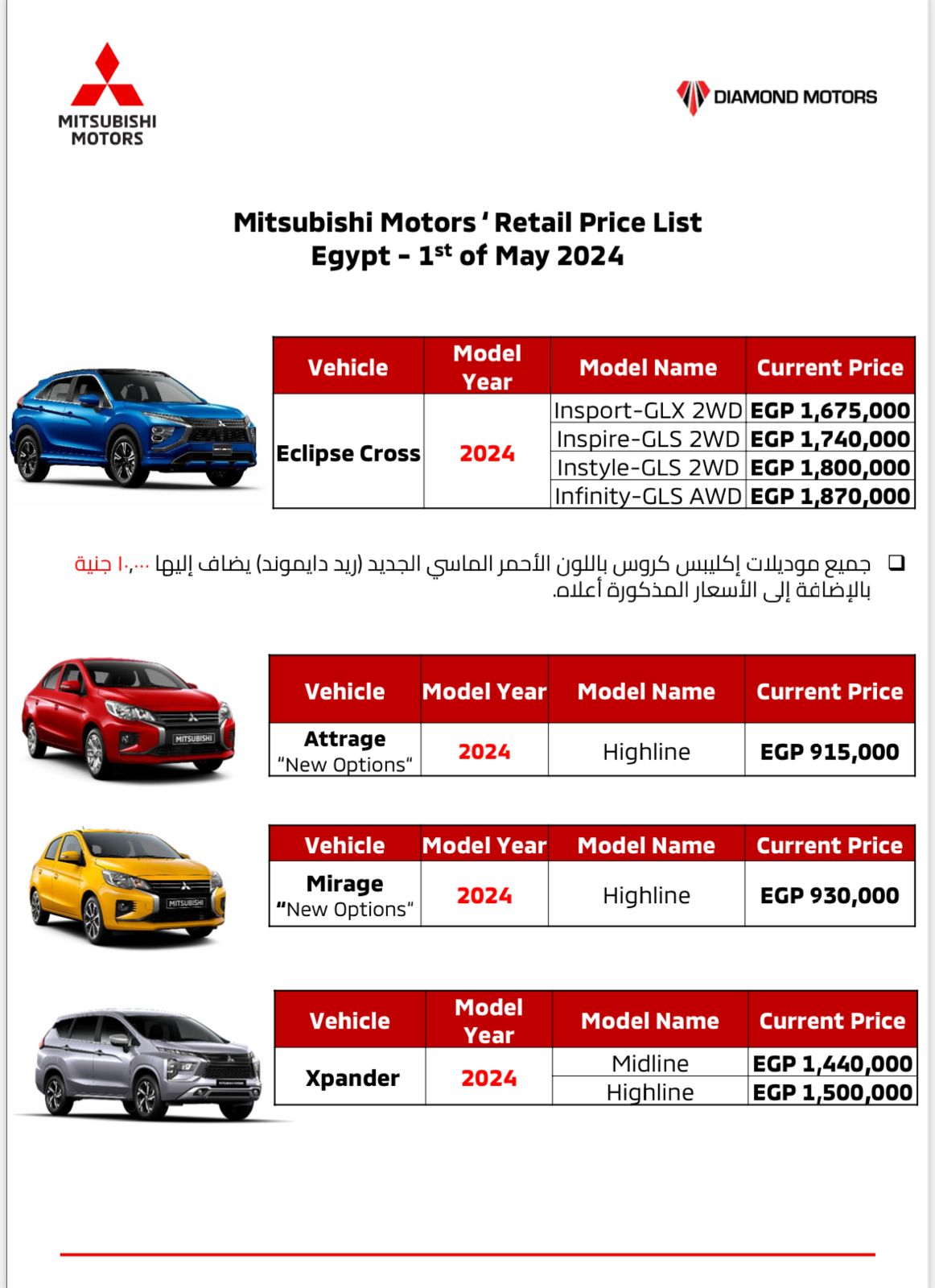 وأخطر الوكيل المحلى للعلامة التجارية كافة الموزعين والتجار بتثبيت أسعار سيارات ميتسوبيشي فى السوق المصرى ونرصدها فى التقرير التالى:-