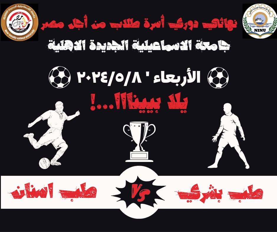 تستعد جامعة الإسماعيلية الجديدة الأهلية لعقد المباريات كرة القدم النهائية المُرتقبة لتحديد الفريق الفائز بلقب دوري الكليات، ودوري أسرة "طلاب من أجل مصر"، وذلك تحت رعاية الدكتور ناصر مندور رئيس جامعة قناة السويس، والمفوض بتسيير أعمال جامعة الإسماعيلية الجديدة الأهلية.
