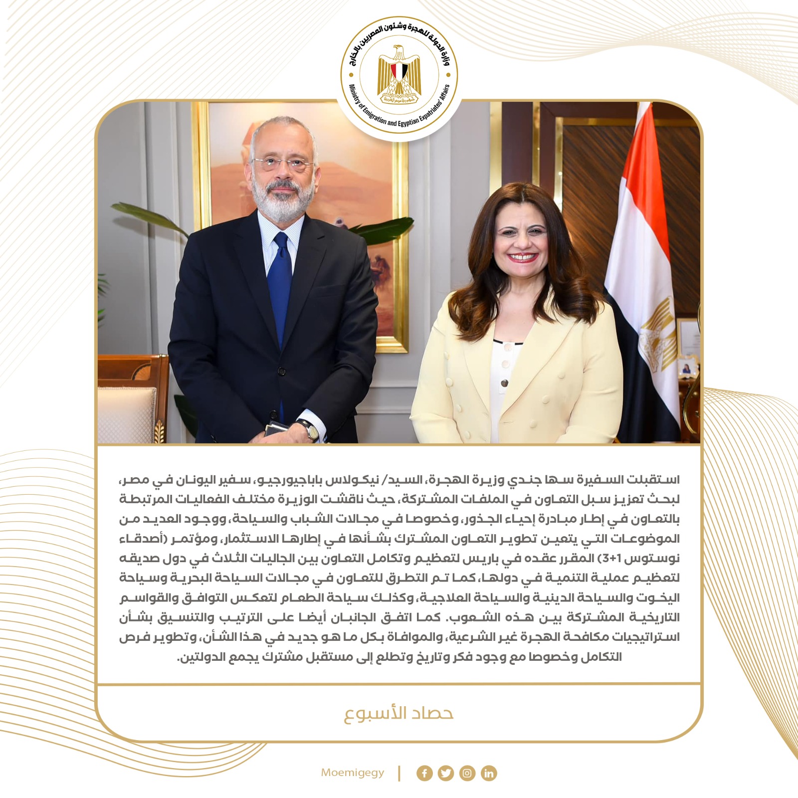 4- استقبلت السفيرة سها جندي وزيرة الهجرة، نيكولاس باباجيورجيو، سفير اليونان في مصر، لبحث تعزيز سبل التعاون في الملفات المشتركة، حيث ناقشت الوزيرة مختلف الفعاليات المرتبطة بالتعاون في إطار مبادرة إحياء الجذور، وخصوصا في مجالات الشباب والسياحة، ووجود العديد من الموضوعات التي يتعين تطوير التعاون المشترك بشأنها في إطارها الاستثمار، ومؤتمر (أصدقاء نوستوس 3+1) المقرر عقده في باريس لتعظيم وتكامل التعاون بين الجاليات الثلاث في دول صديقه لتعظيم عملية التنمية في دولها، كما تم التطرق للتعاون في مجالات السياحة البحرية وسياحة اليخوت والسياحة الدينية والسياحة العلاجية، وكذلك سياحة الطعام لتعكس التوافق والقواسم التاريخية المشتركة بين هذه الشعوب. كما اتفق الجانبان أيضا على الترتيب والتنسيق بشأن استراتيجيات مكافحة الهجرة غير الشرعية، والموافاة بكل ما هو جديد في هذا الشأن، وتطوير فرص التكامل وخصوصا مع وجود فكر وتاريخ وتطلع إلى مستقبل مشترك يجمع الدولتين.