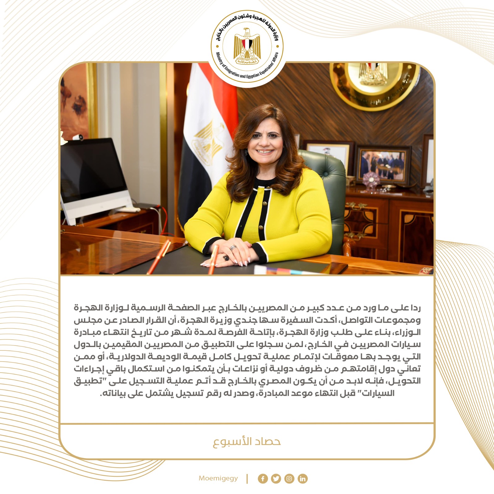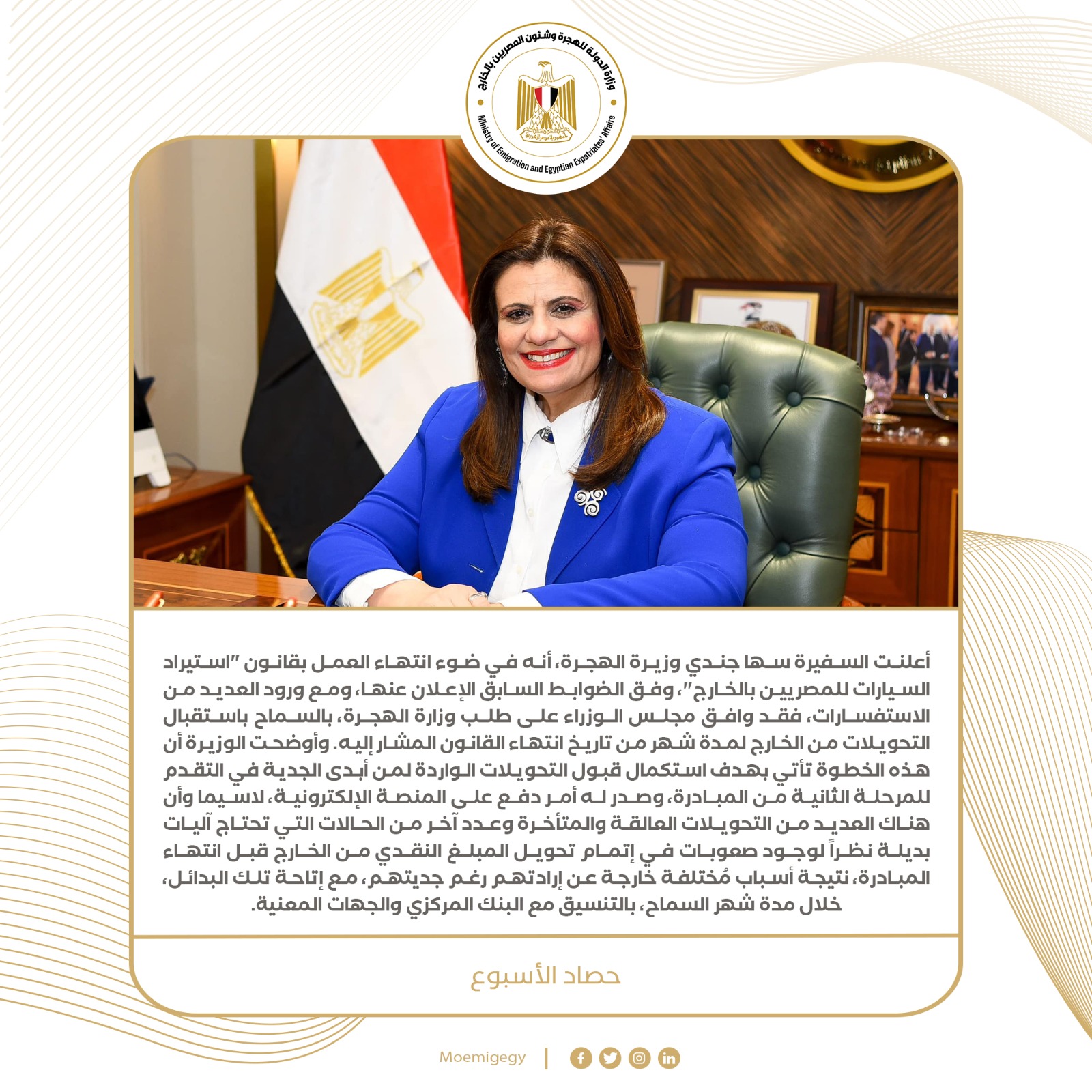 2- أعلنت السفيرة سها جندي وزيرة الهجرة، أنه في ضوء انتهاء العمل بقانون "استيراد السيارات للمصريين بالخارج"، وفق الضوابط السابق الإعلان عنها، ومع ورود العديد من الاستفسارات، فقد وافق مجلس الوزراء على طلب وزارة الهجرة، بالسماح باستقبال التحويلات من الخارج لمدة شهر من تاريخ انتهاء القانون المشار إليه. وأوضحت الوزيرة أن هذه الخطوة تأتي بهدف استكمال قبول التحويلات الواردة لمن أبدى الجدية في التقدم للمرحلة الثانية من المبادرة، وصدر له أمر دفع على المنصة الإلكترونية، لاسيما وأن هناك العديد من التحويلات العالقة والمتأخرة وعدد آخر من الحالات التي تحتاج آليات بديلة نظرًا لوجود صعوبات في إتمام تحويل المبلغ النقدي من الخارج قبل انتهاء المبادرة، نتيجة أسباب مُختلفة خارجة عن إرادتهم رغم جديتهم، مع إتاحة تلك البدائل، خلال مدة شهر السماح، بالتنسيق مع البنك المركزي والجهات المعنية.