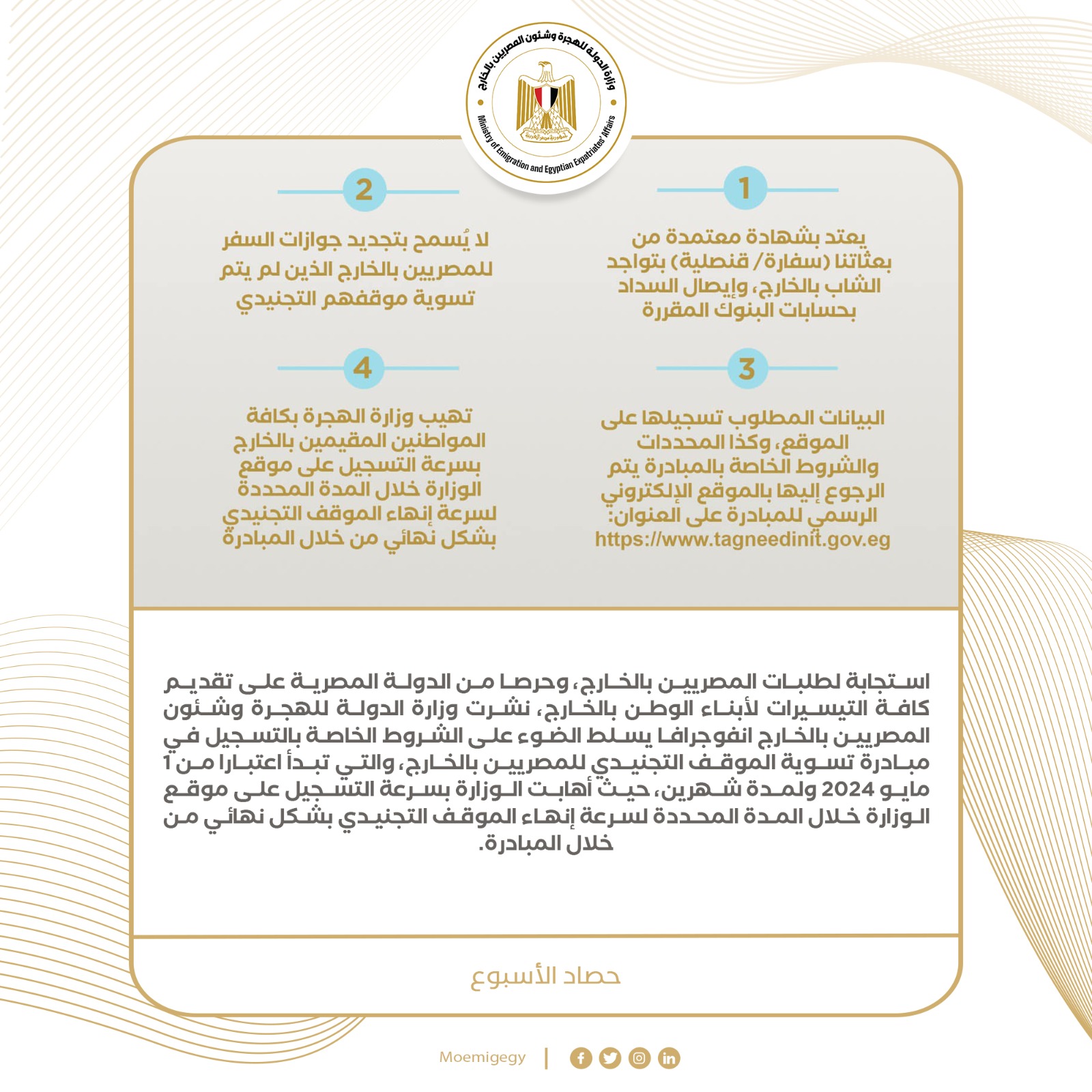 8- استجابة لطلبات المصريين بالخارج، وحرصا من الدولة المصرية على تقديم كافة التيسيرات لأبناء الوطن بالخارج، نشرت وزارة الدولة للهجرة وشئون المصريين بالخارج انفوجرافا يسلط الضوء على الشروط الخاصة بالتسجيل في مبادرة تسوية الموقف التجنيدي للمصريين بالخارج، والتي تبدأ اعتبارا من ١ مايو ٢٠٢٤ ولمدة شهرين، حيث أهابت الوزارة بسرعة التسجيل على موقع الوزارة خلال المدة المحددة لسرعة إنهاء الموقف التجنيدي بشكل نهائي من خلال المبادرة.