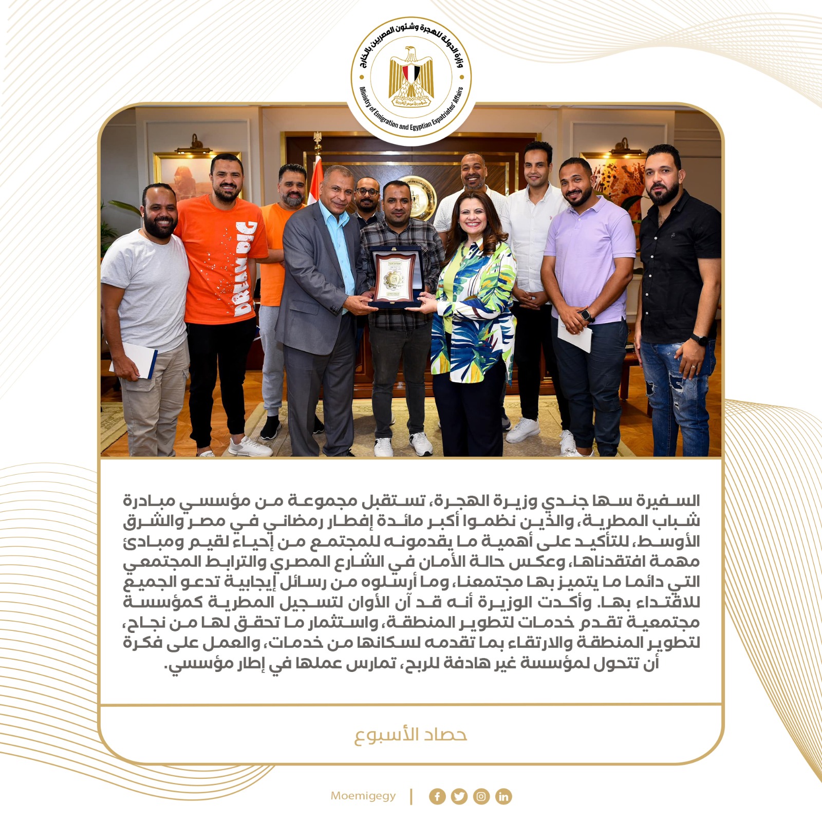5- التقت السفيرة سها جندي وزيرة الهجرة، مجموعة من مؤسسي مبادرة شباب المطرية، الذين نظموا أكبر مائدة إفطار رمضاني في مصر والشرق الأوسط، للتأكيد على أهمية ما يقدمونه للمجتمع من إحياء لقيم ومبادئ مهمة مفتقدة، وعكس حالة الأمان في الشارع المصري والترابط المجتمعي التي دائما ما يتميز بها المجتمع المصري، وما أرسلوه من رسائل إيجابية تدعو الجميع للاقتداء بها، وأكدت الوزيرة أنه قد آن الأوان لتسجيل المطرية كمؤسسة مجتمعية تقدم خدمات لتطوير المنطقة، واستثمار ما تحقق لها من نجاح، لتطوير المنطقة والارتقاء بما تقدمه لسكانها من خدمات، والعمل على فكرة أن تتحول لمؤسسة غير هادفة للربح، تمارس عملها في إطار مؤسسي.