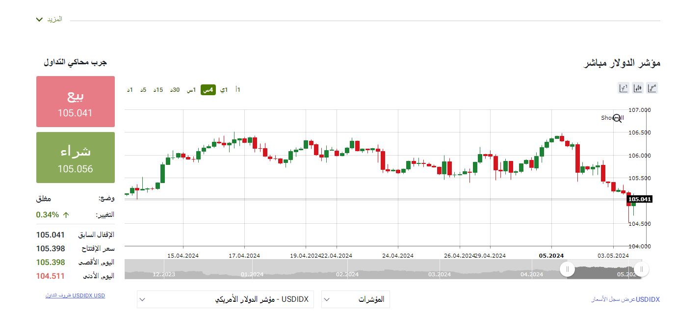مؤشر الدولار (DXY)، ارتفع مؤشر الدولار الأمريكي بقوة خلال حركة التداولات العالمية، اليوم السبت الموافق 4 مايو 2024 الذي ينطلق بالتوازي مع هبوط قوي لمؤشر الذهب، حيث ارتفع مؤشر الدولار ليسجل الآن عند مستوى 105.041 للبيع، و105.056 للشراء بحركة التداولات العالمية.