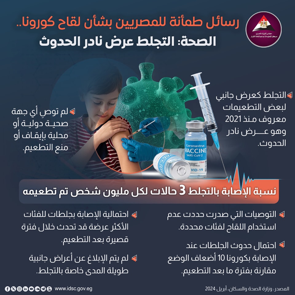 وقالت الوزارة إن احتمال الإصابة بالجلطات جراء الإصابة بالفيروس قد يصل إلى 10 أضعاف، مقارنة بالجلطات التي قد تحدث بعد تلقي اللقاح، مطمئنة المصريين بعد تلقي أي بلاغات عن أعراض جانبية طويلة المدى خاصة بالتجلط.