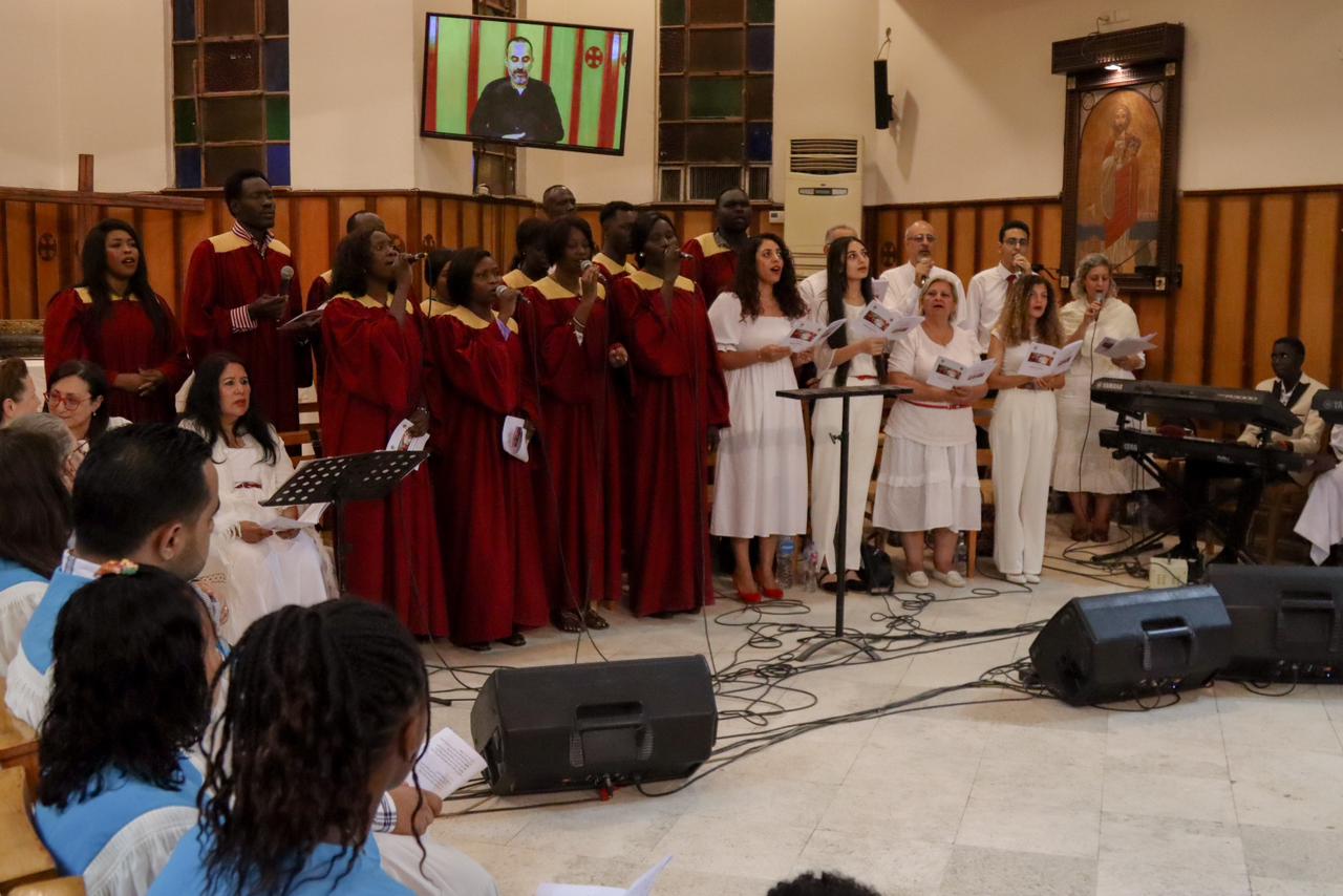 بينما رنم كورال الكاتدرائية ترنيمة "المسيح اليوم قام" التي تحتفي بقيامة المسيح وترنم كجزء من طقوس قداس عيد القيامة المجيد.
