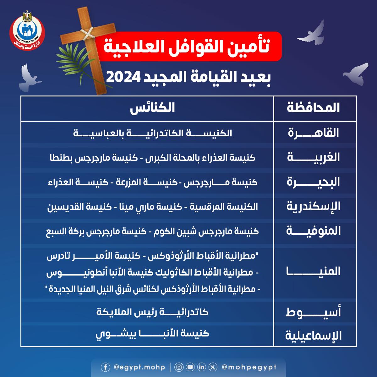 أعلنت وزارة الصحة عن الدفع بعدد من القوافل العلاجية المجانية بمحيط الكنائس في عدد من المحافظات، تزامنا مع الاحتفال بعيد القيامة المجيد .