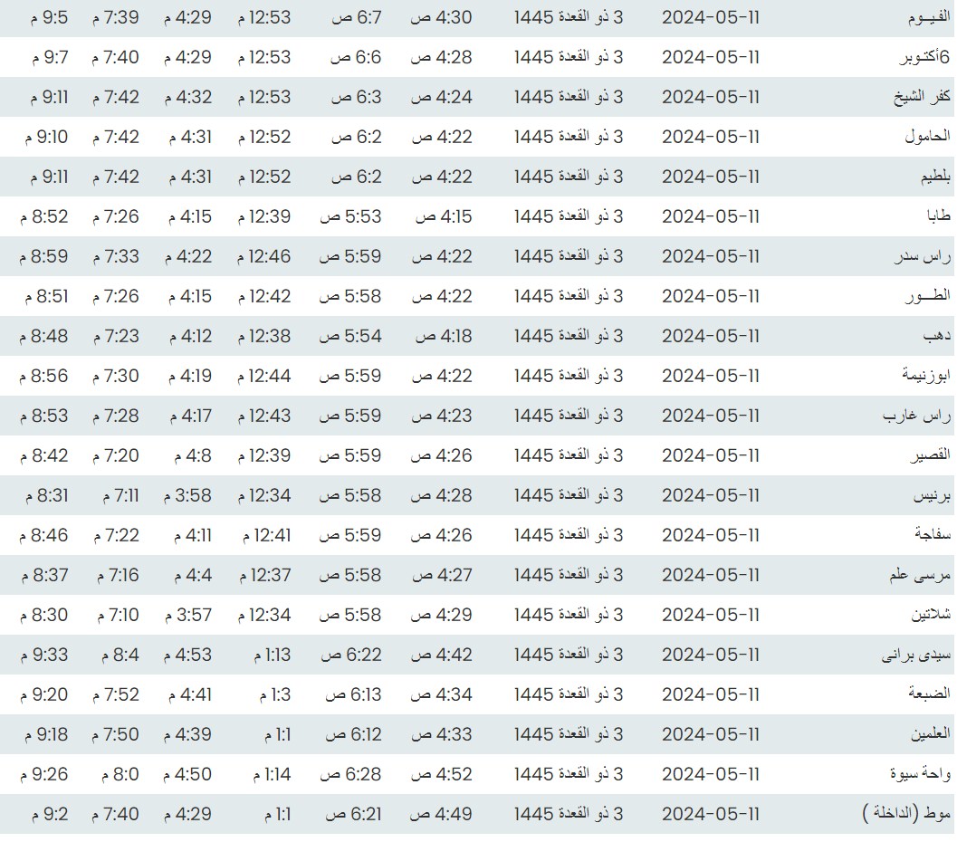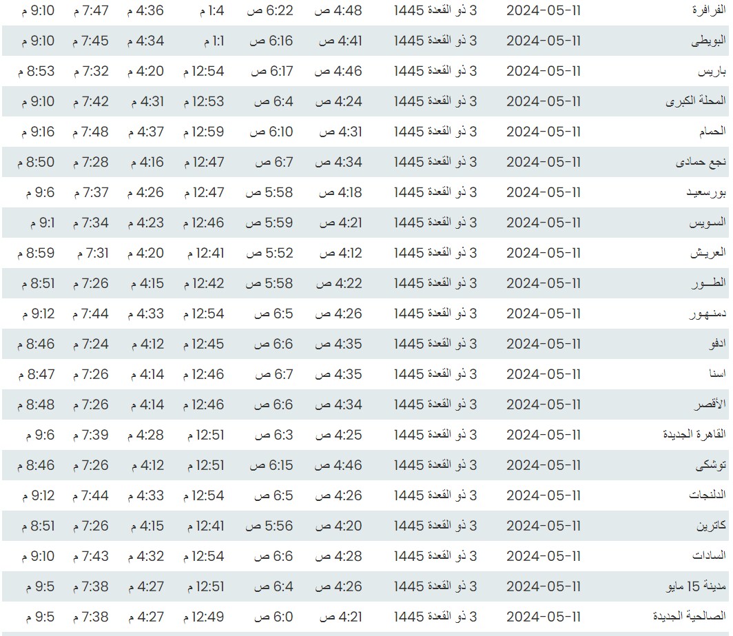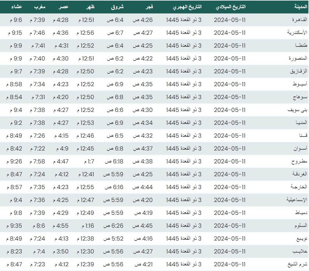 وفيما يلي مواقيت الصلاة، لعدد من مدن ومحافظات الجمهورية من واقع بيانات الهيئة العامة للمساحة