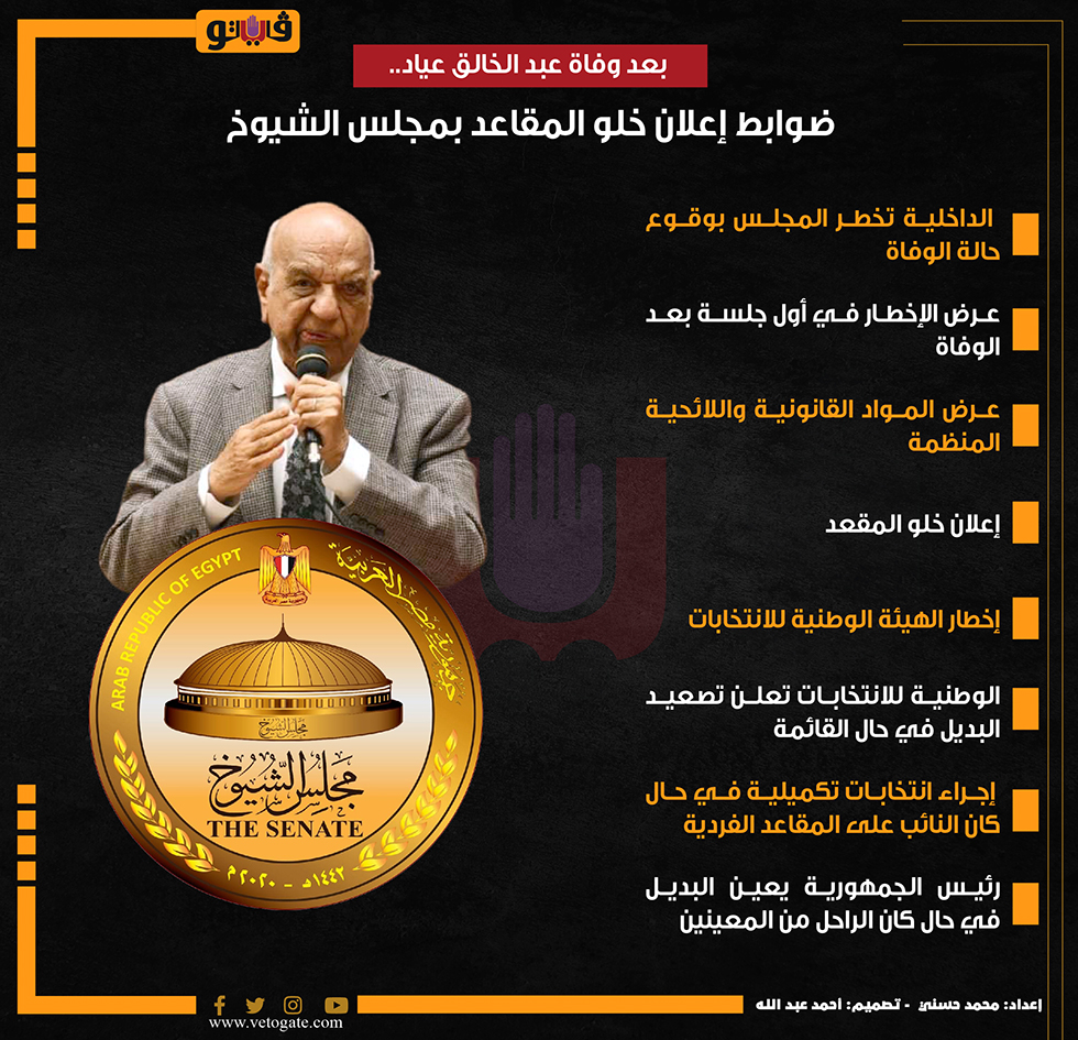 بعد وفاة عبد الخالق عياد.. ضوابط إعلان خلو المقاعد بمجلس الشيوخ (إنفوجراف) الأحد 05/مايو/2024 - 12:44 م 5/5/2024 12:44:37 PM ضوابط إعلان خلو المقاعد بمجلس الشيوخ، فيتو محمد حسنى شارك طباعة 18 حجم الخط شارك طباعة