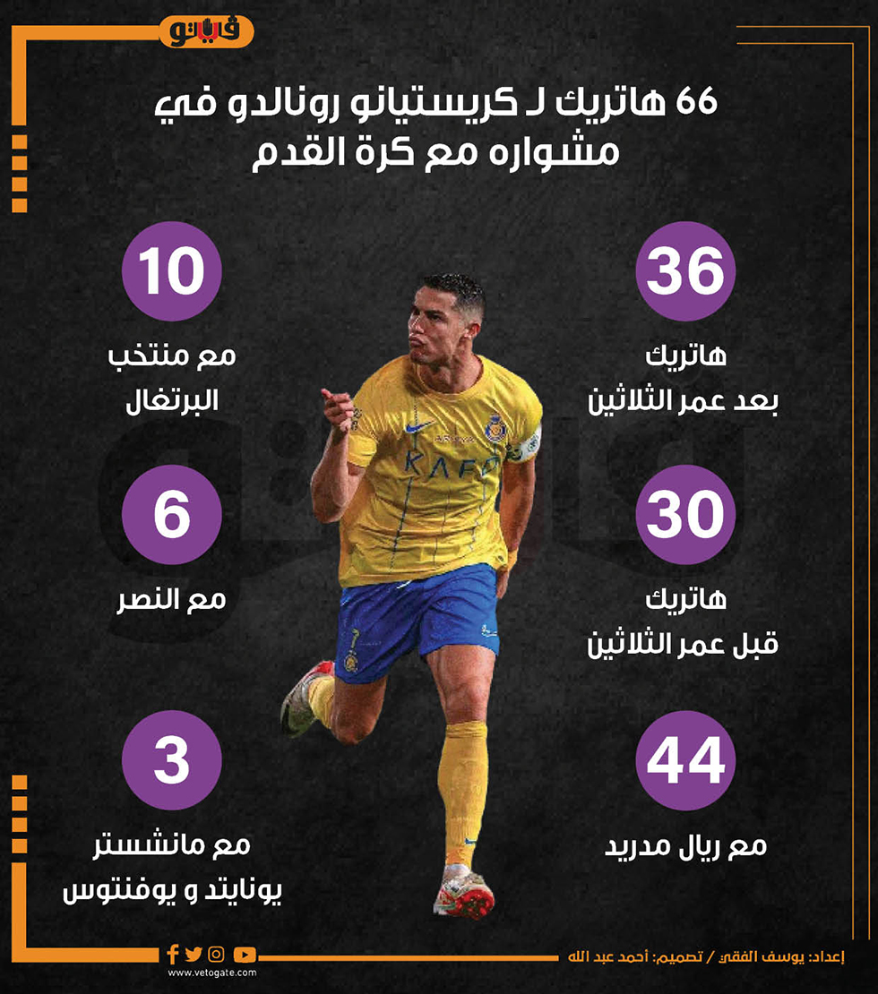 66 هاتريك لـ كريستيانو رونالدو في مشواره مع كرة القدم (انفوجراف) الإثنين 06/مايو/2024 - 03:22 م 5/6/2024 3:22:52 PM رونالدو، فيتو يوسف الفقي شارك طباعة 18 حجم الخط شارك طباعة رونالدو كريستيانو رونالدو هاتريك رونالدو عدد هاتريك رونالدو أرقام رونالدو