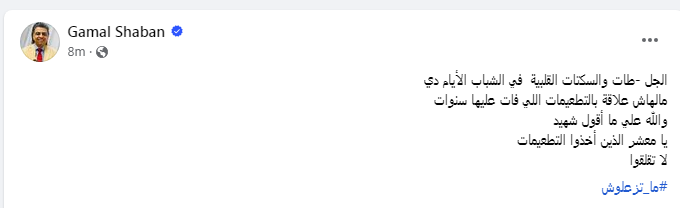 وعن الجلطات القلبية والسكتات وعلاقتها بالتطعيم باللقاحات قال الدكتور جمال شعبان: "الجلطات والسكتات القلبية في الشباب الأيام دي مالهاش علاقة بالتطعيمات اللي فات عليها سنوات والله على ما أقول شهيد يا معشر الذين أخذوا التطعيمات لا تقلقوا".