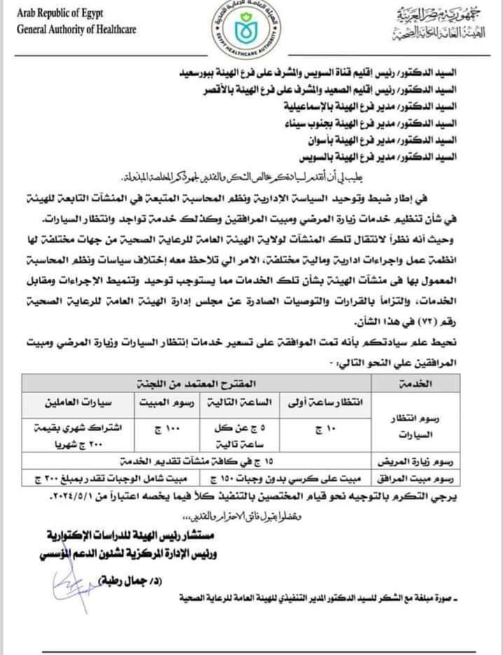 أعلنت هيئة الرعاية الصحية عن زيادة أسعار خدمات زيارة المرضى والمرافقين وتواجد السيارات داخل مستشفيات الرعاية الصحية بمحافظات التأمين الصحي الشامل.