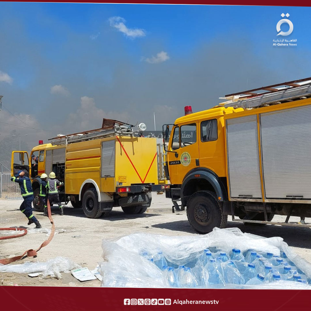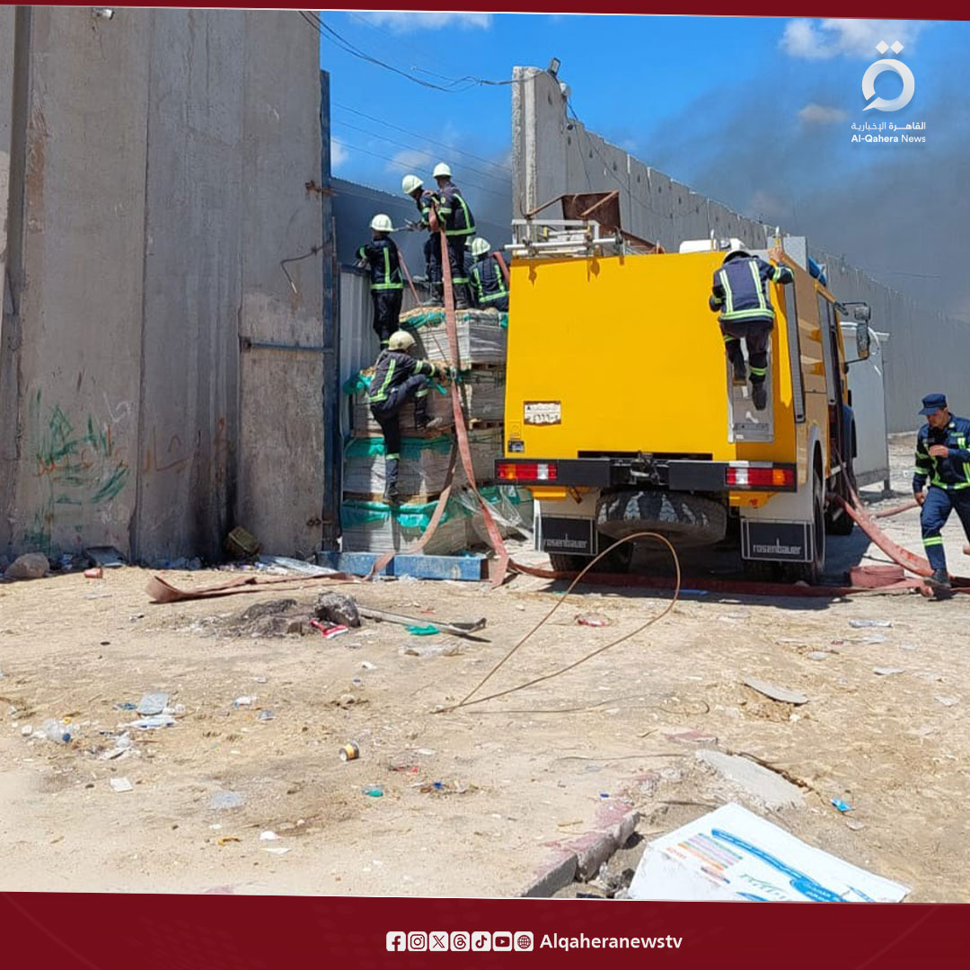 عناصر الإطفاء المصرية تتصدى للحرائق الناتجة عن استهداف مخازن المساعدات بالجانب الفلسطيني